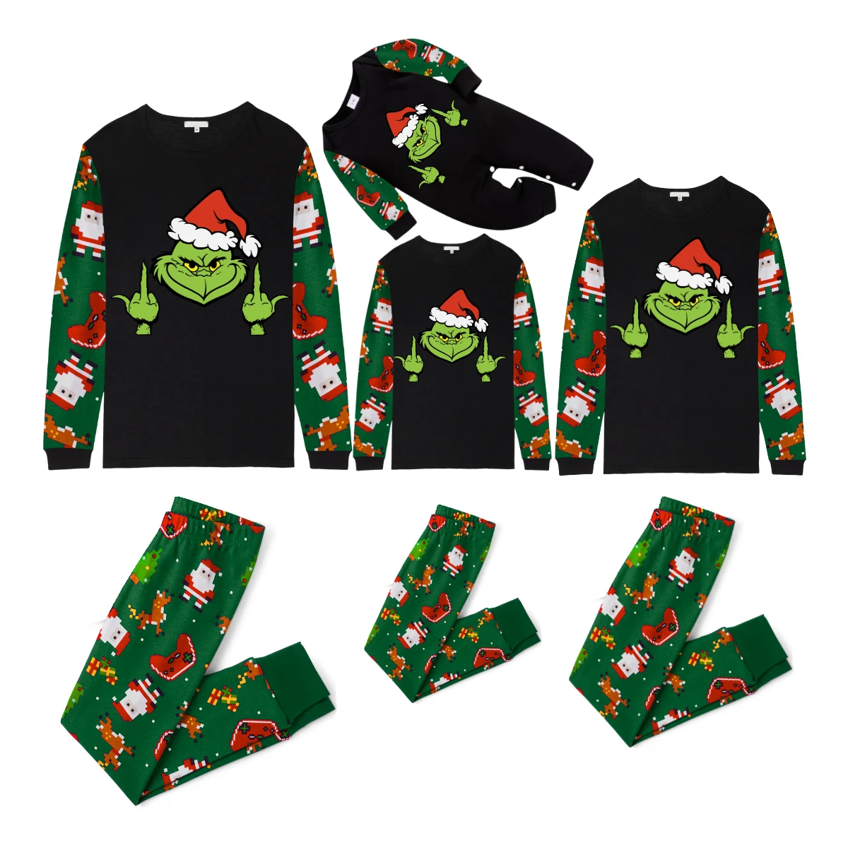 Grinch Santa Family Christmas Pajamas Black Top with Green Santa Print Pants