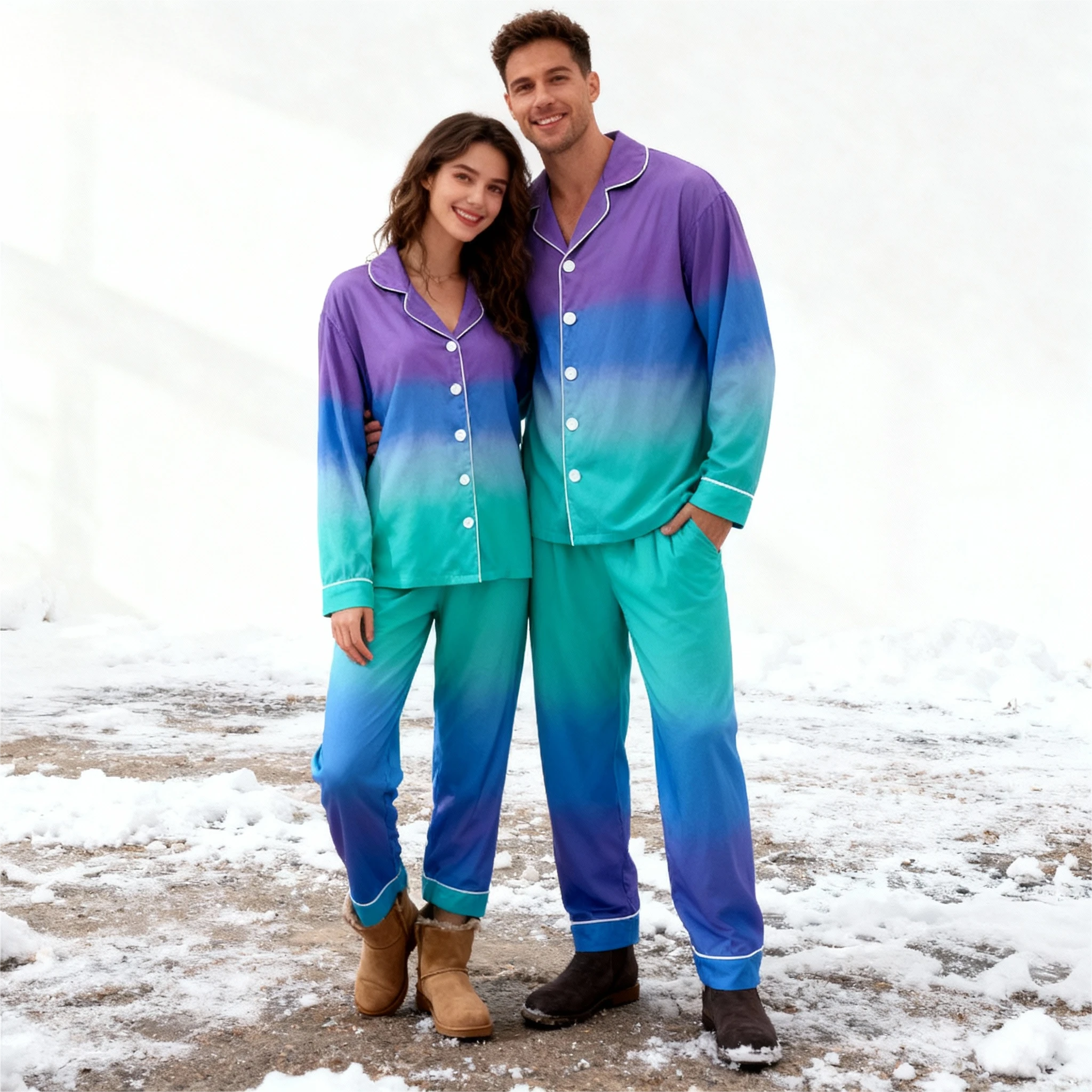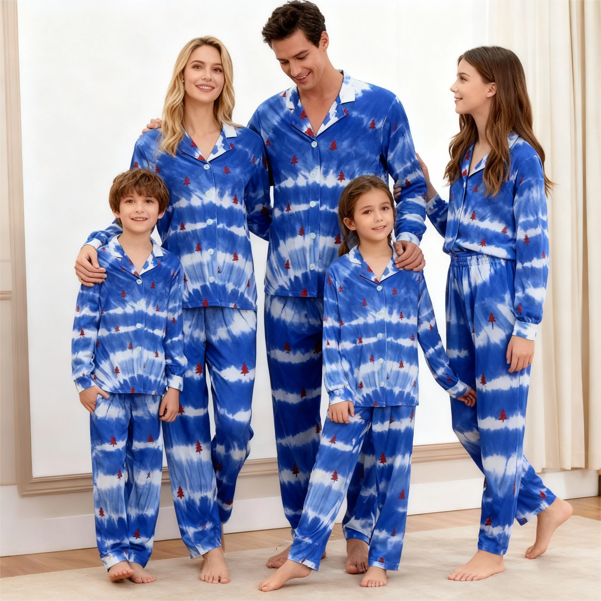 Holiday Family Button-Up Blue & Tree Tie-dyed Christmas Pajamas Set