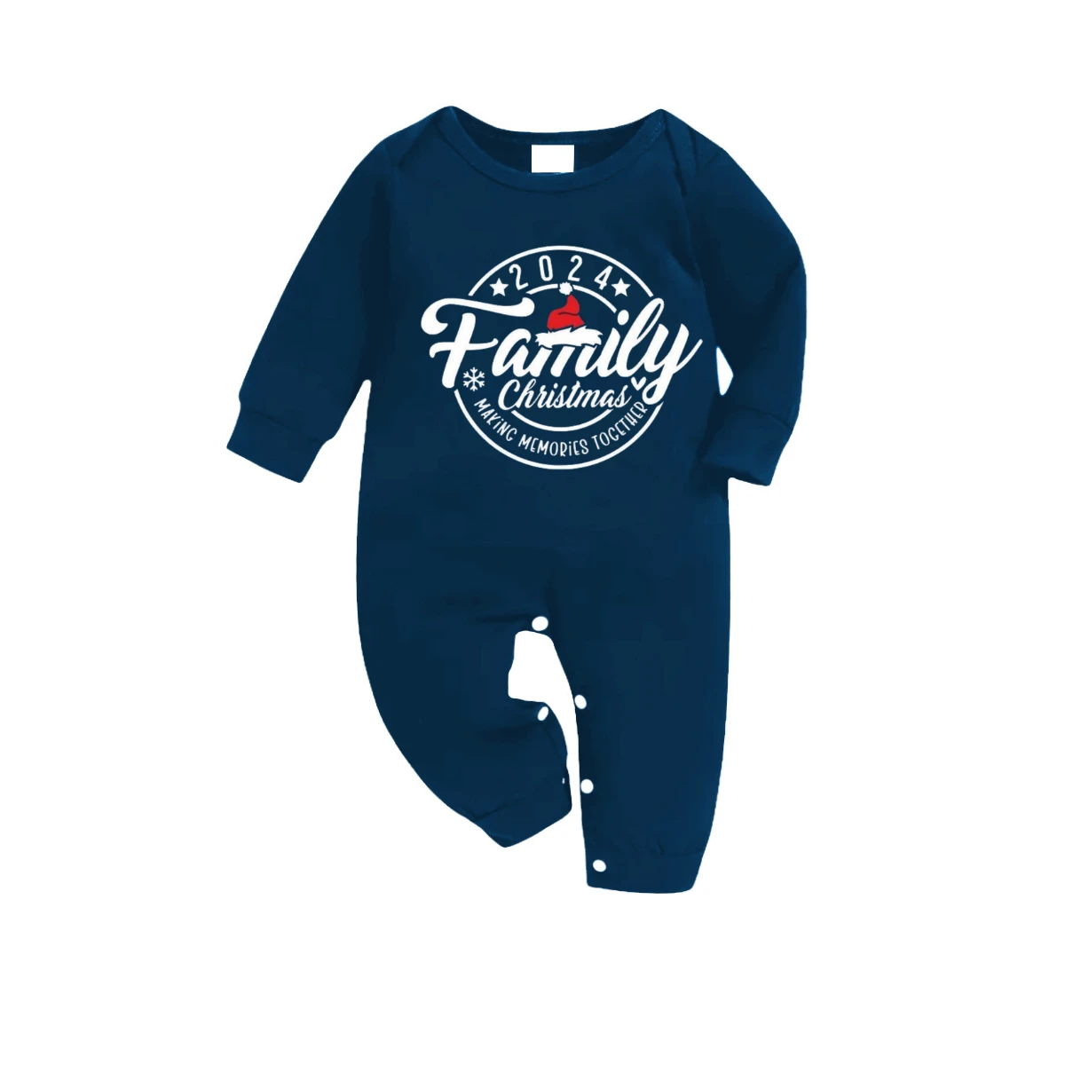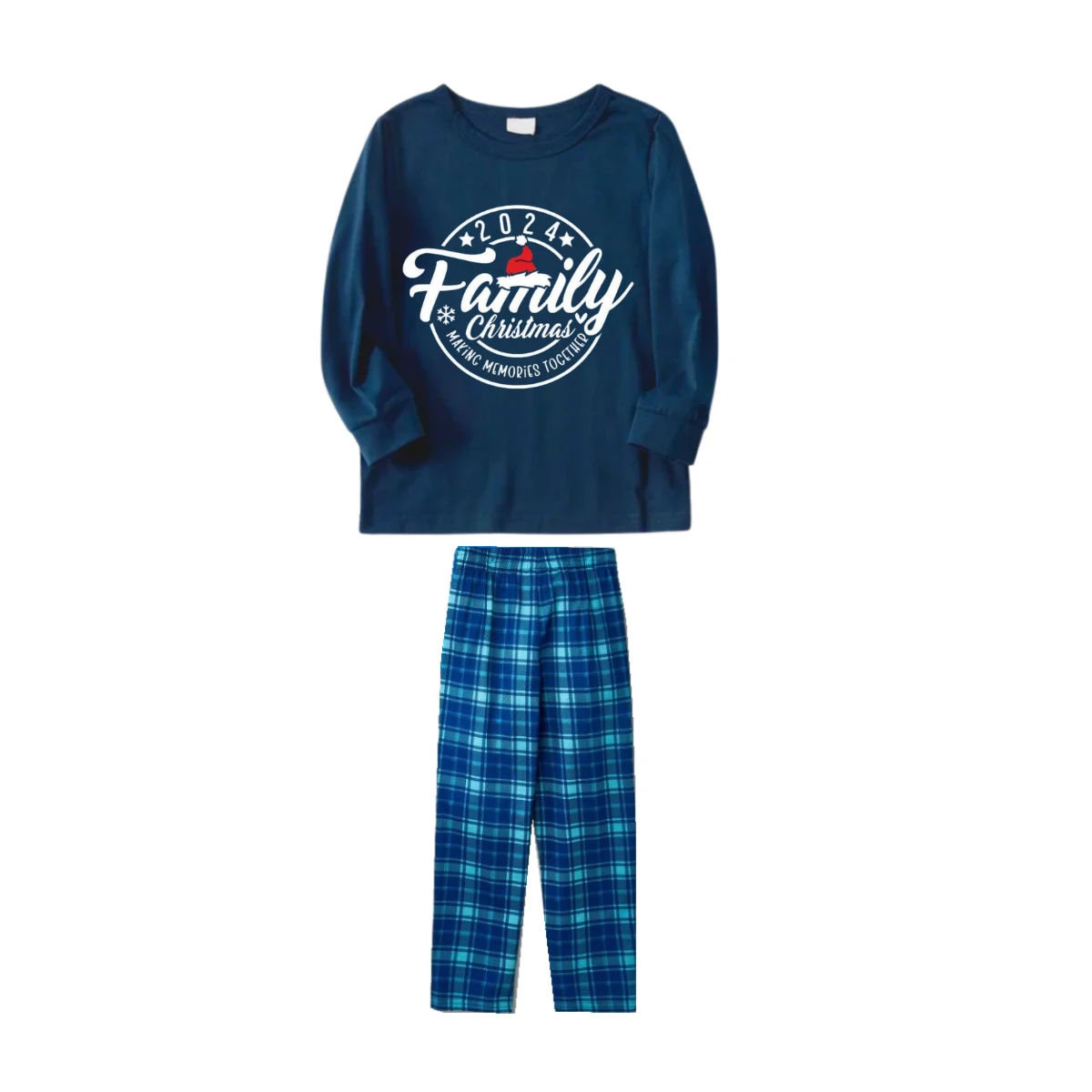 "2024 Family Christmas Making Memories Together" Text Ring Pattern - Blue Long Sleeve Top With Blue Plaid Family Matching Pajamas