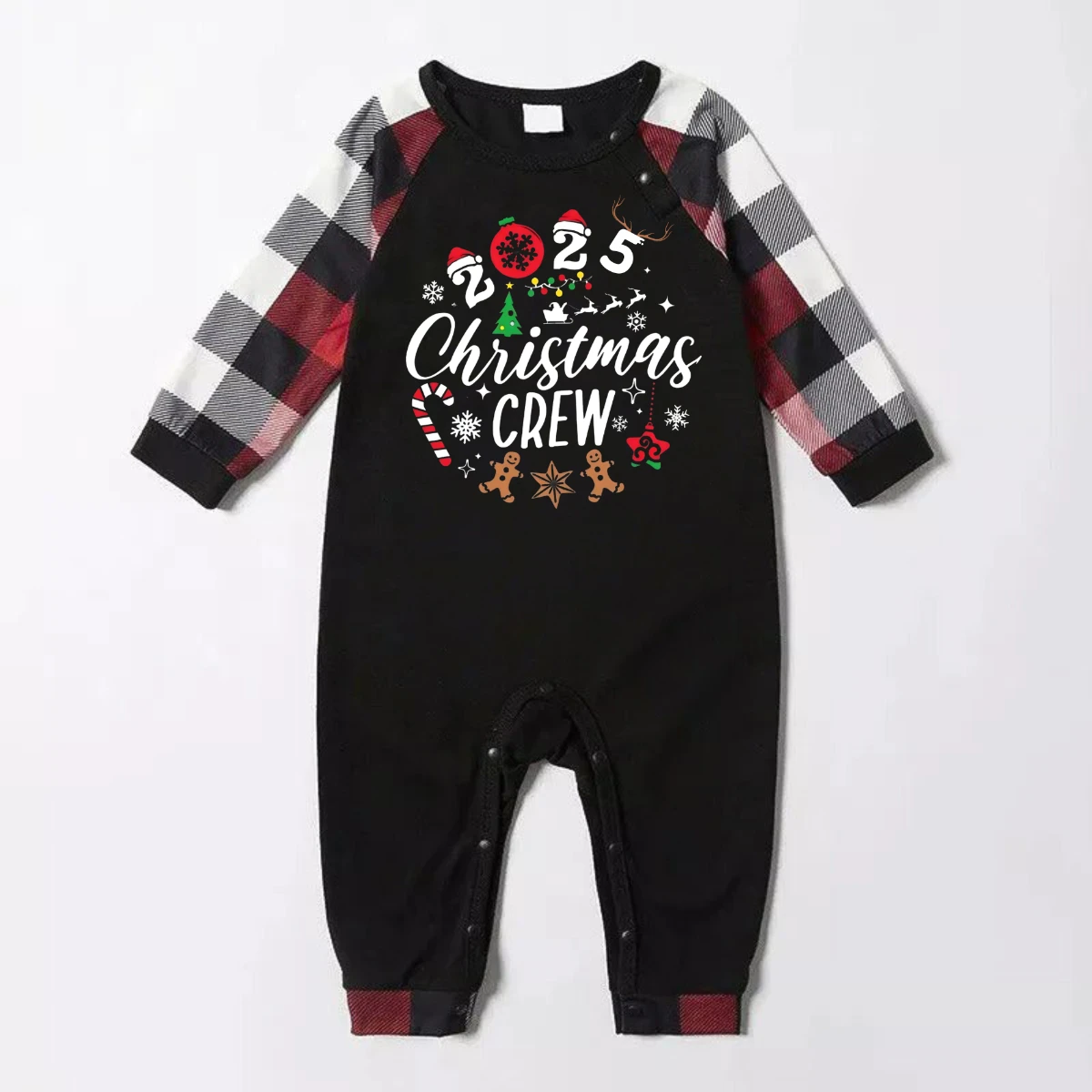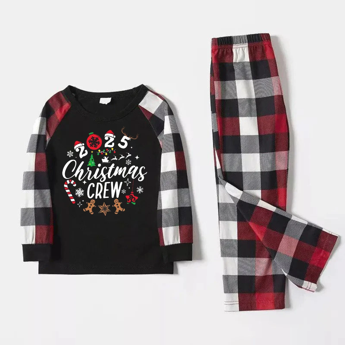 "2025 Christmas CREW " Text Printed Pattern - Black Top with Red&Black&White Plaid Sleeves - Family Matching Pajamas