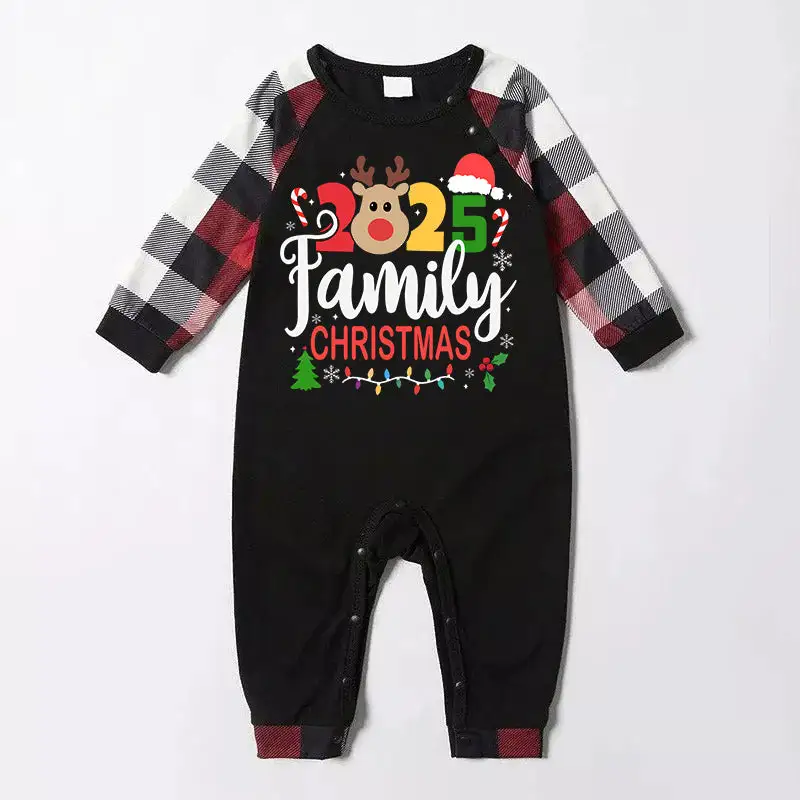 "2025 FAMILY CHRISTMAS " Colorful Text And Deer & Snowflake Printed Pattern - Black Top with Red&Black&White Plaid Sleeves - Family Matching Pajamas