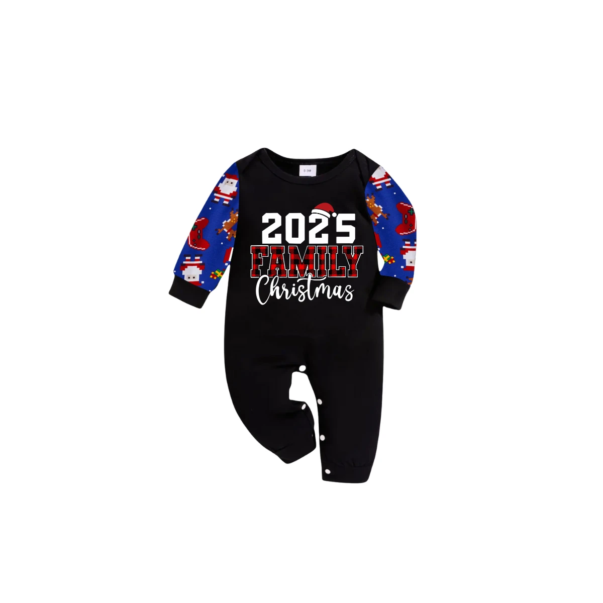 2025 Family Christmas Family Pajamas Set - Black Top, Blue Pants, Blue Christmas Cartoon Sleeves, Letter Print