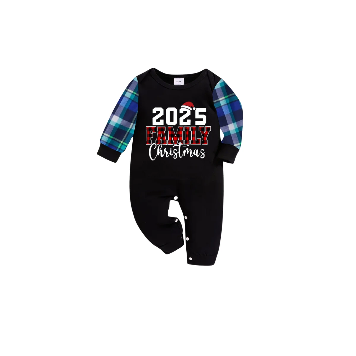 2025 Family Christmas Family Pajamas Set - Black Top, Blue Pants, Blue-Green Plaid Sleeves, Letter Print