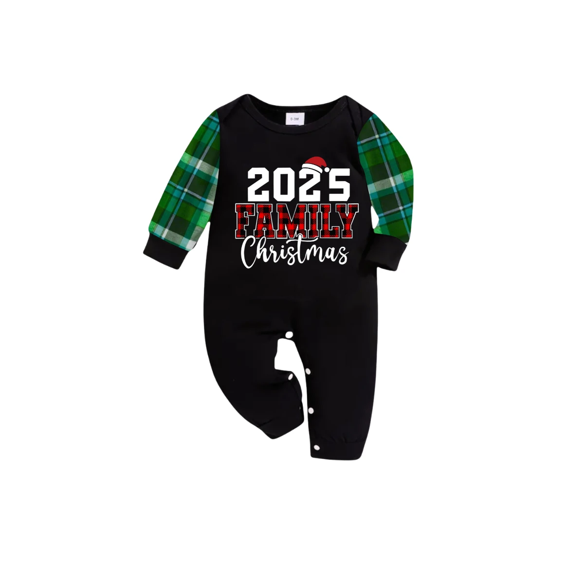 2025 Family Christmas Family Pajamas Set - Black Top, Green Pants, Blue-Green Plaid Sleeves, Letter Print