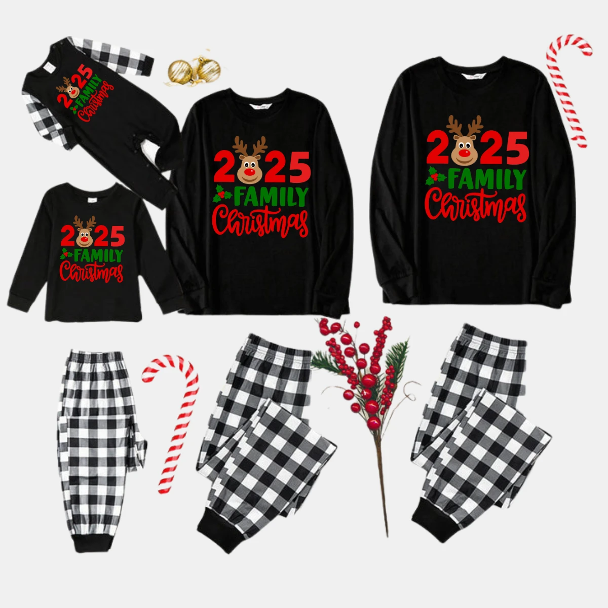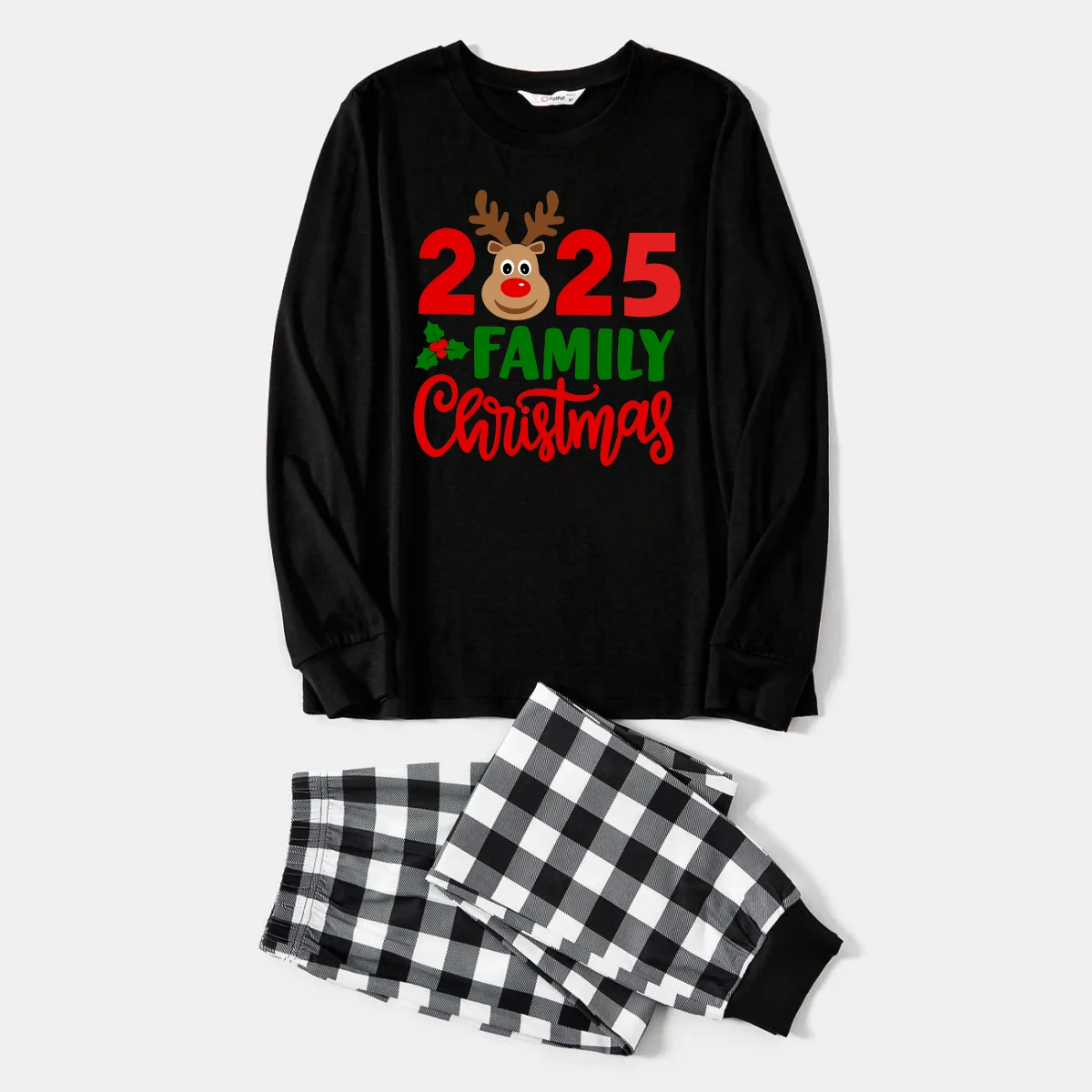 "2025 Family Christmas" Moose Letter Print Black Long Sleeve Top with Black And White Plaid Pants Family Matching Pajamas