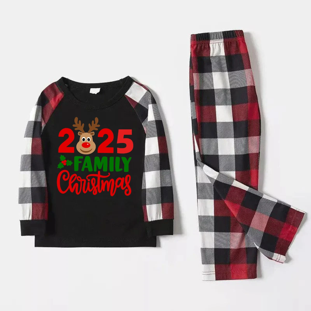 "2025 Family Christmas" Moose Letter Prints Red & Black & Grey & White Plaid Family Matching Pajamas