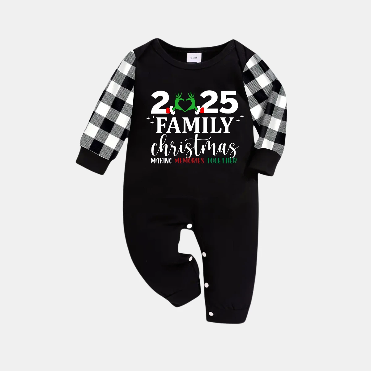 "2025 Family Christmas" Quirky Heart Letter Print Black Long Sleeve Top with Black And White Plaid Pants Family Matching Pajamas