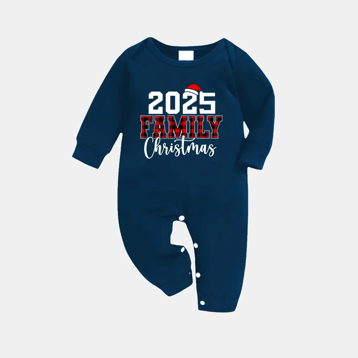2025 Family Christmas Text Print Blue Long Sleeve Top With Blue Plaid Family Matching Pajamas
