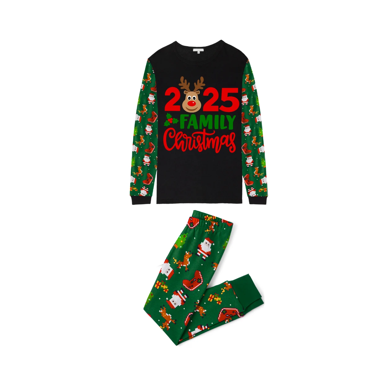 2025 Reindeer Family Christmas Family Pajamas Set - Black Top / Green Santa Print Pants / Green Santa Print Sleeves