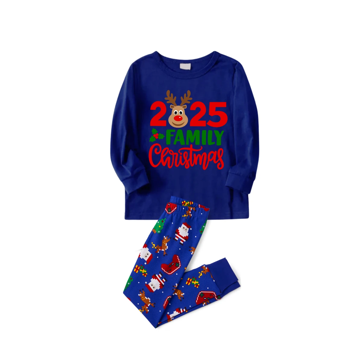 2025 Reindeer Family Christmas Family Pajamas Set - Blue Top / Blue Santa Print Pants / Blue Santa Print Sleeves