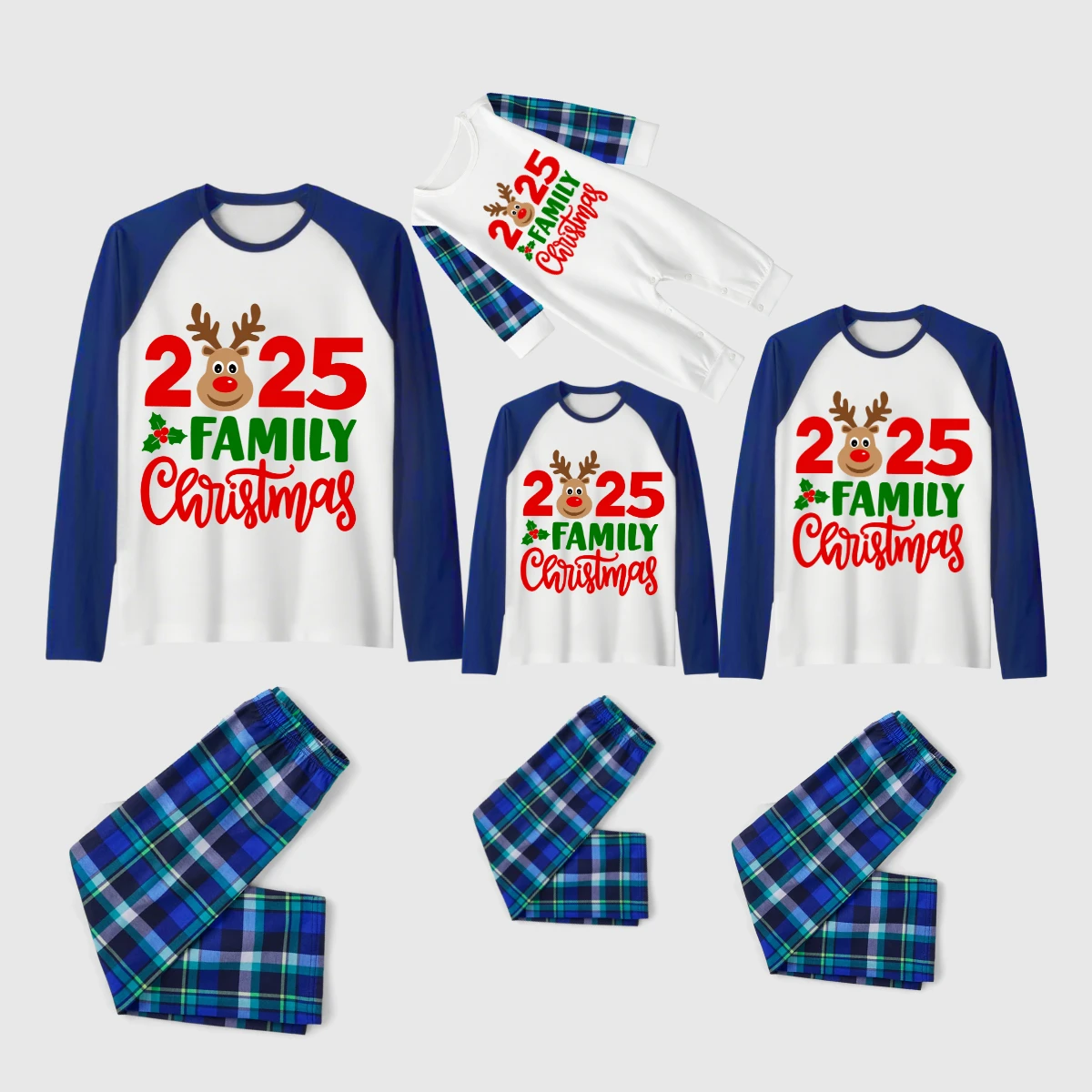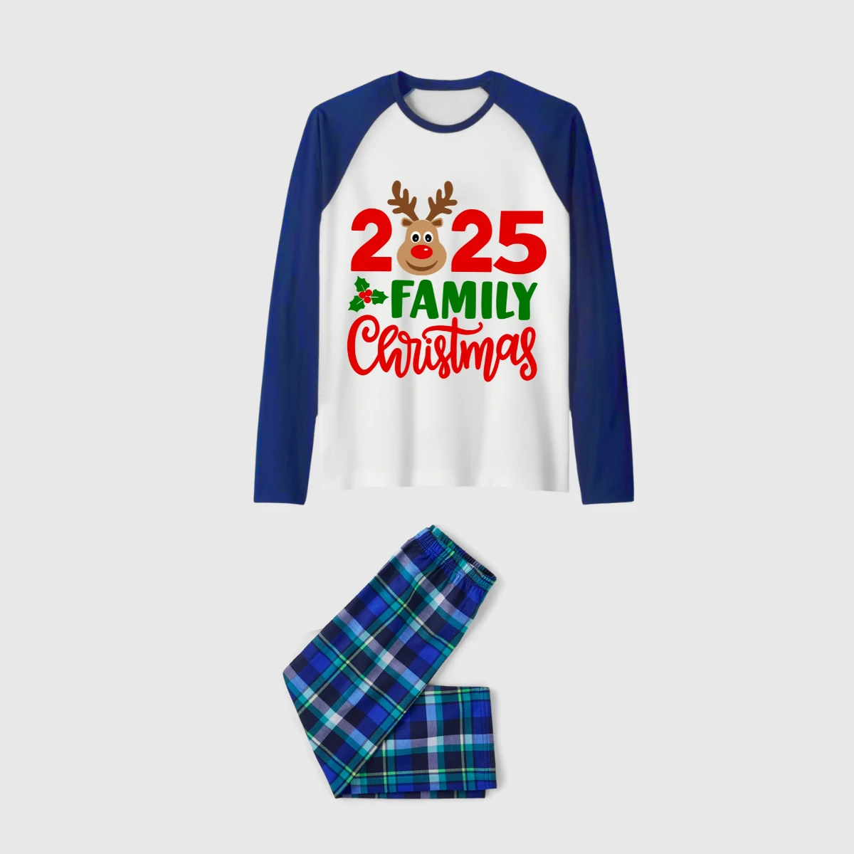 2025 Reindeer Family Christmas Family Pajamas Set - White Top / Blue Green Plaid Pants / Blue Sleeves