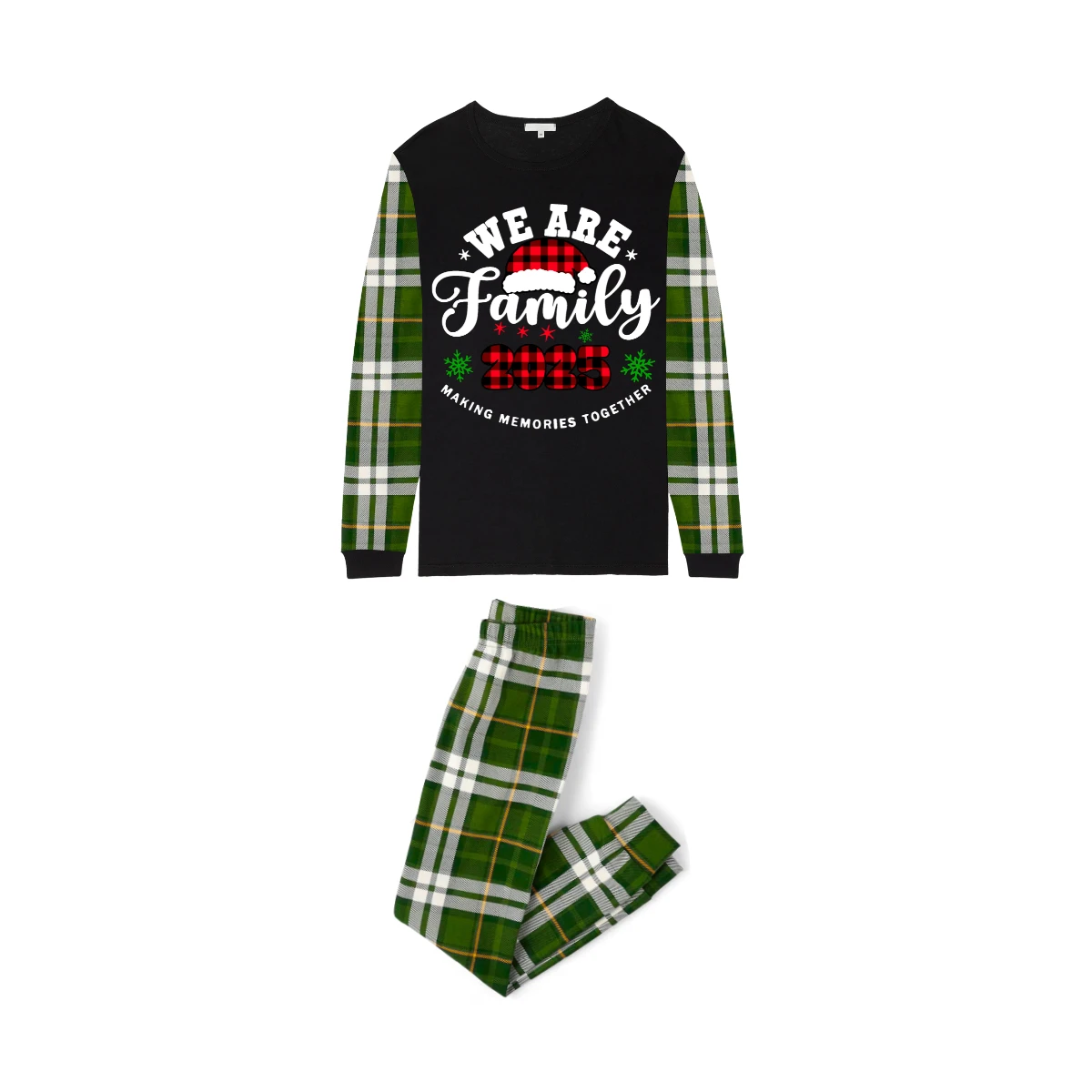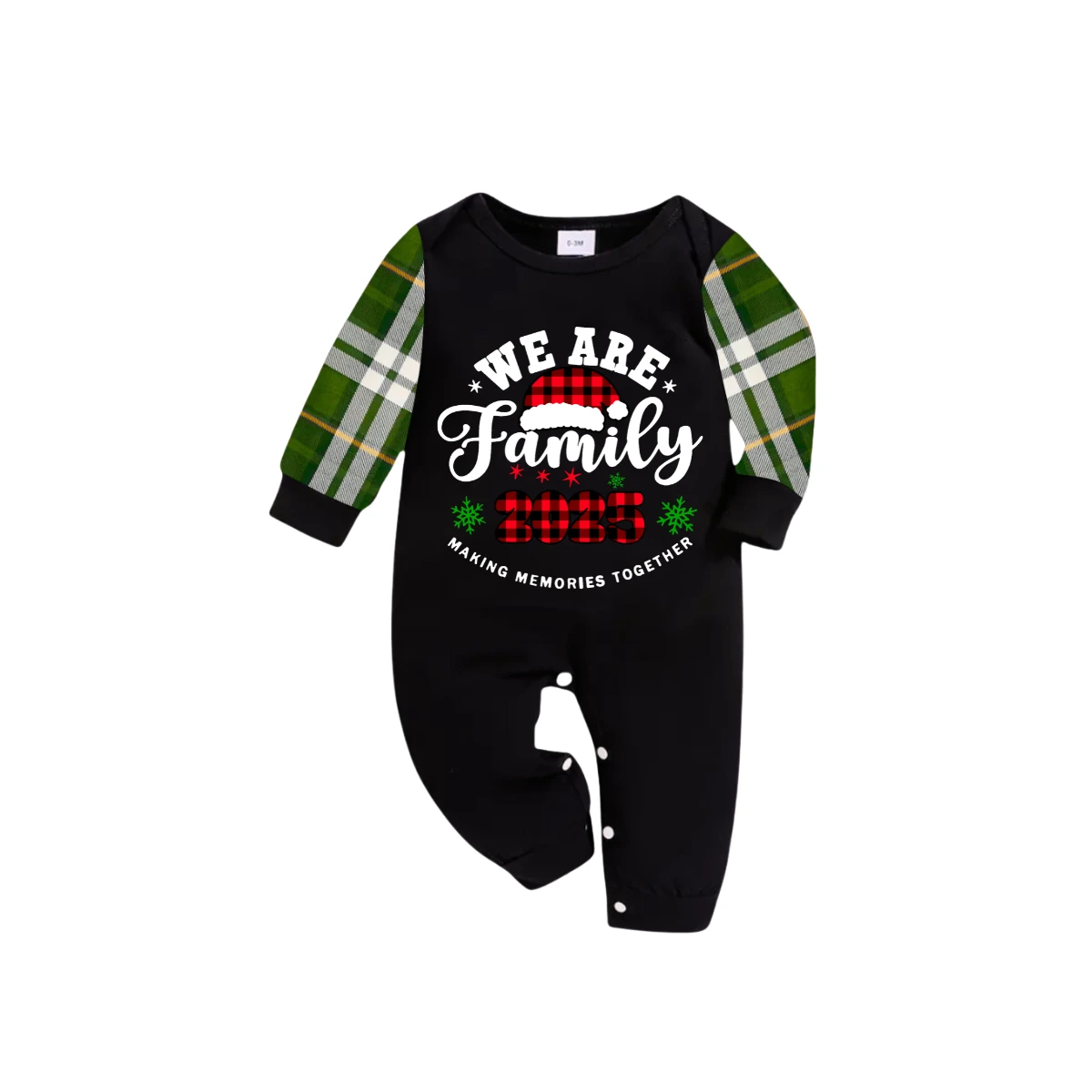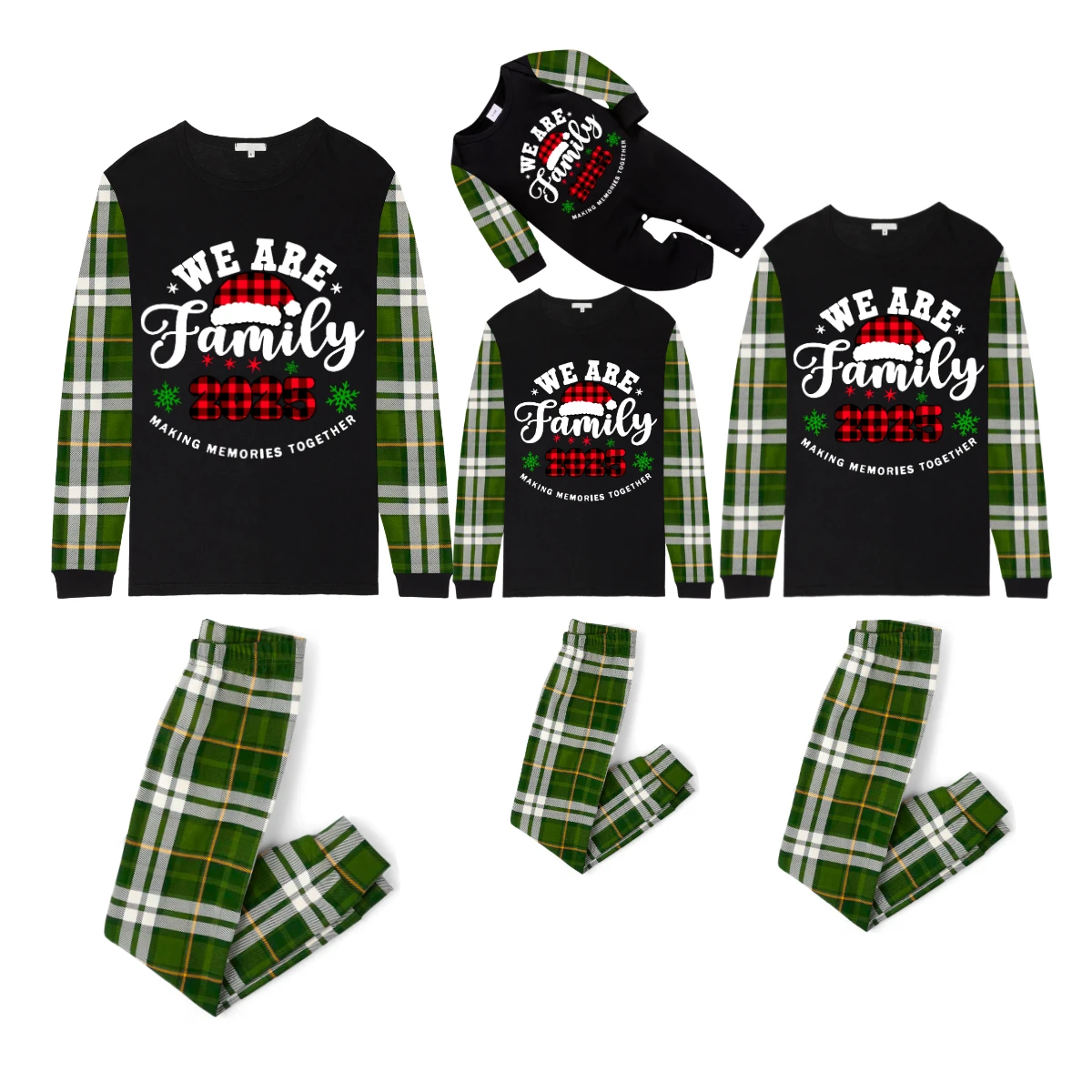 2025 We Are Family Christmas Family Pajamas Set - Black Top / Green Plaid Pants / Green Plaid Sleeves