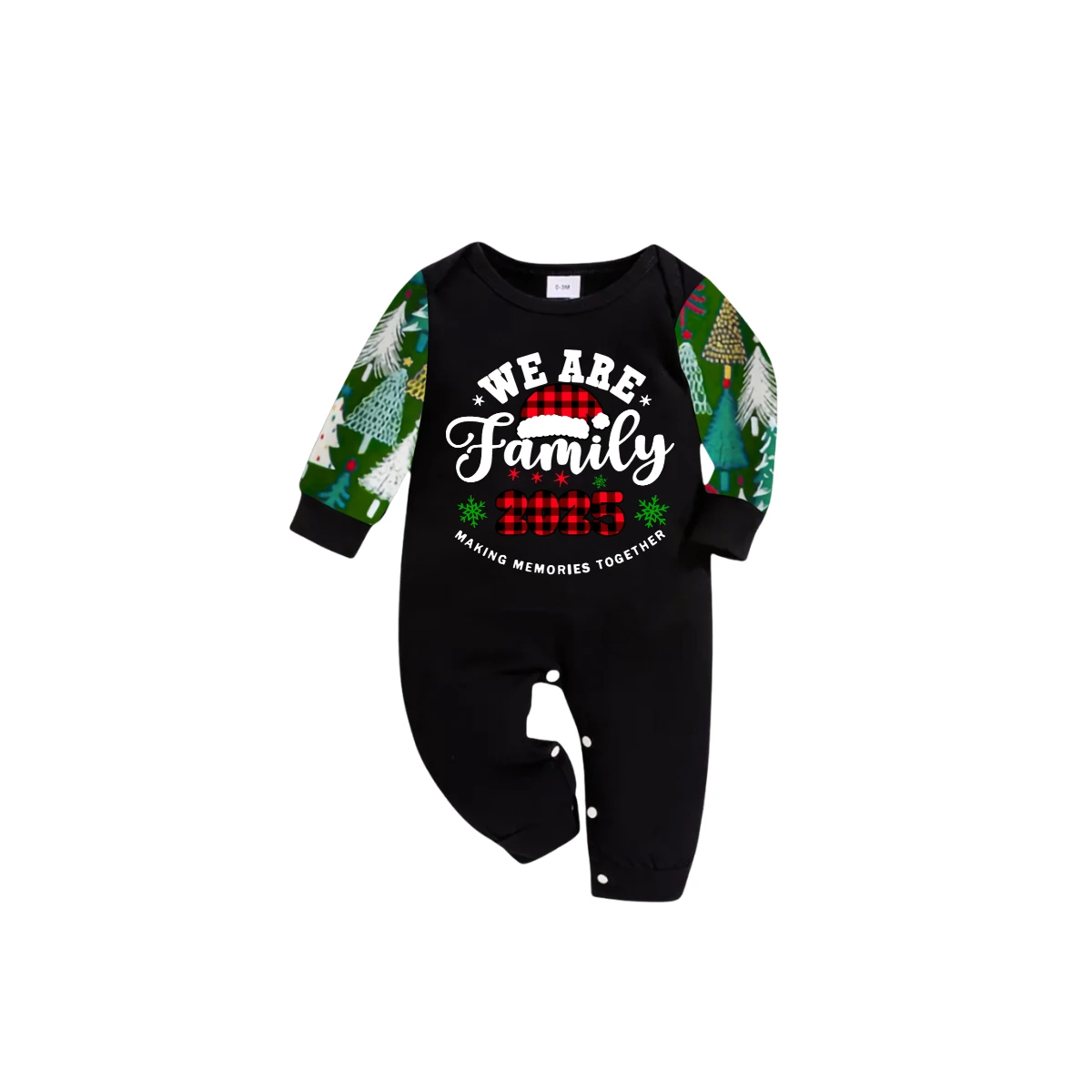 2025 We Are Family Christmas Family Pajamas Set - Black Top / Green Tree Print Pants / Green Tree Print Sleeves