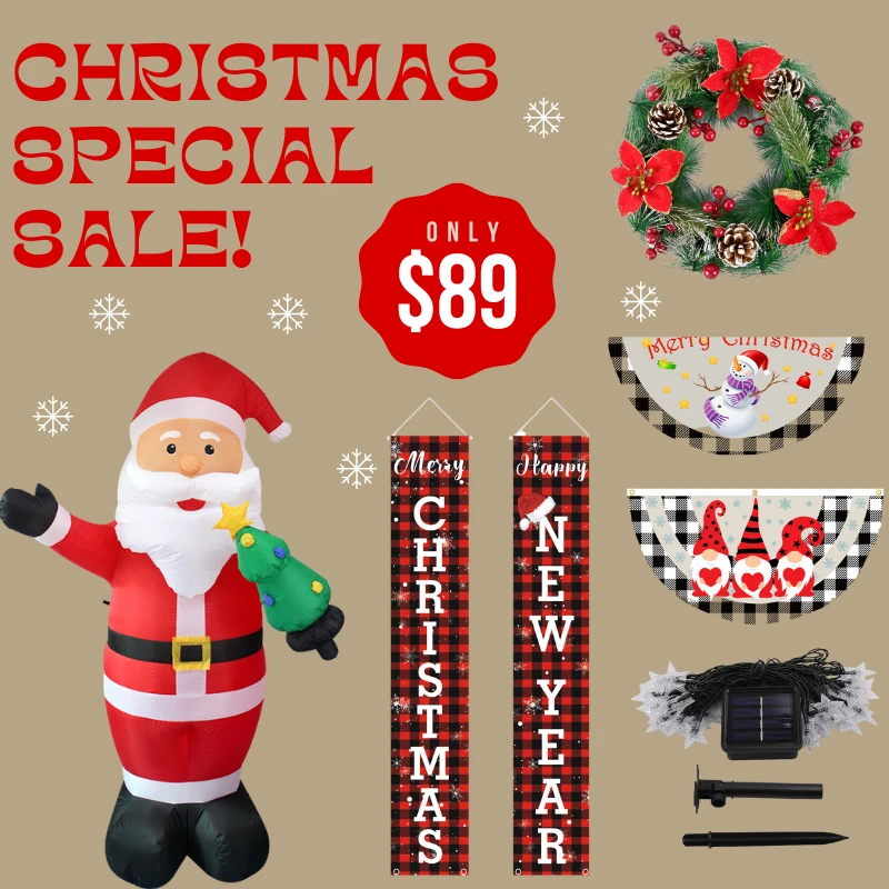 Christmas Outdoor Decorations Package Include:8 FT Christmas Inflatable Santa Claus + Solar Star String Lights + Christmas Porch Signs + christmas wreath + Christmas Bunting Flag