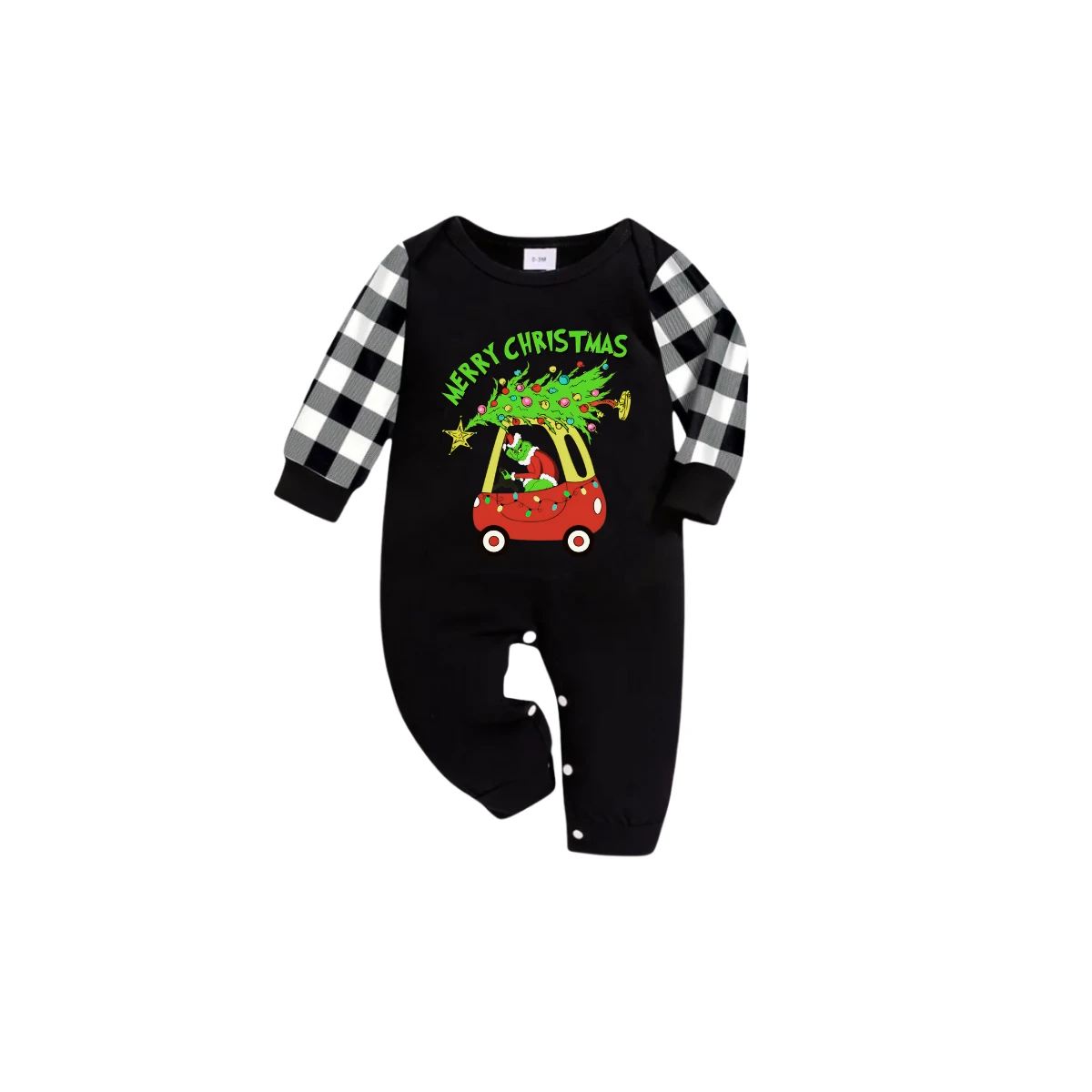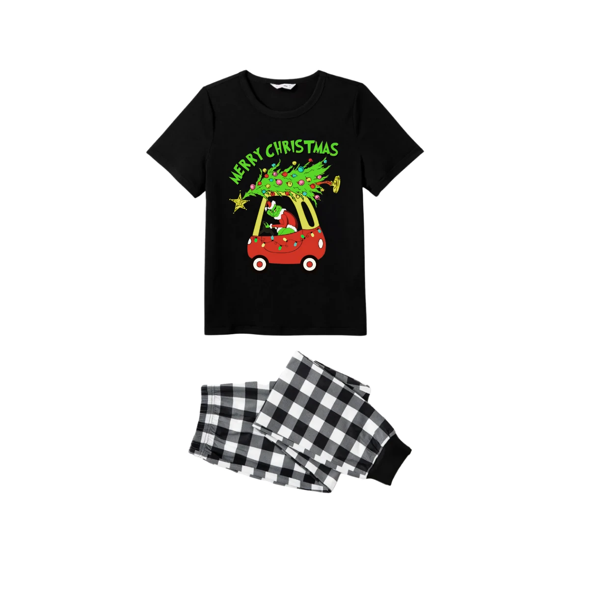 Black and White Plaid Christmas Short Sleeve Pajamas Set With Grinch and Christmas Tree Print
