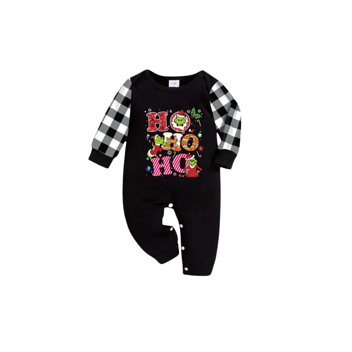 Black and White Plaid Christmas Short Sleeve Pajamas Set With Grinch and "HO HO HO" Text Print
