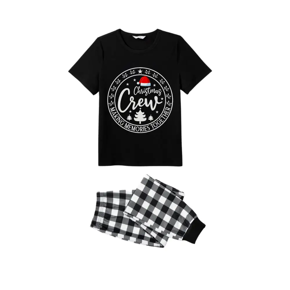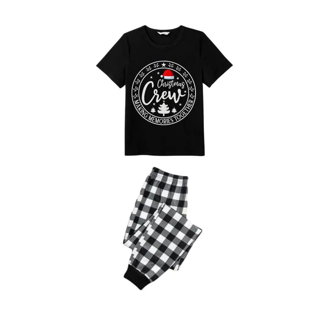 Black and White Plaid Short Sleeve Christmas Family Pajamas Set With Santa Hat and "Christmas Crew Making Memories Together" Print