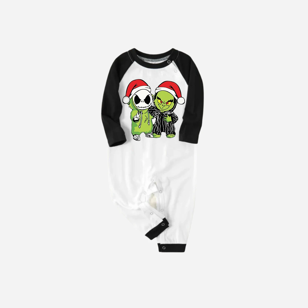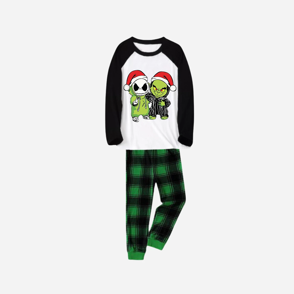 Black Raglan Top Green Plaid Christmas Pajamas Set With Grinch and Cartoon Pattern Print