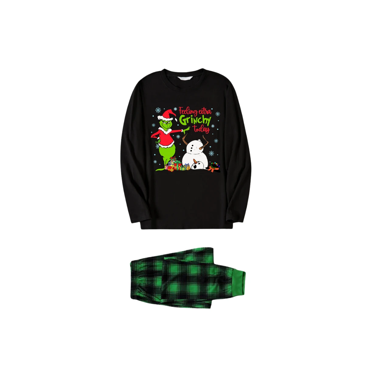 Black Top and Green Plaid Pants Christmas Pajamas Set With Grinch and Snowman Print