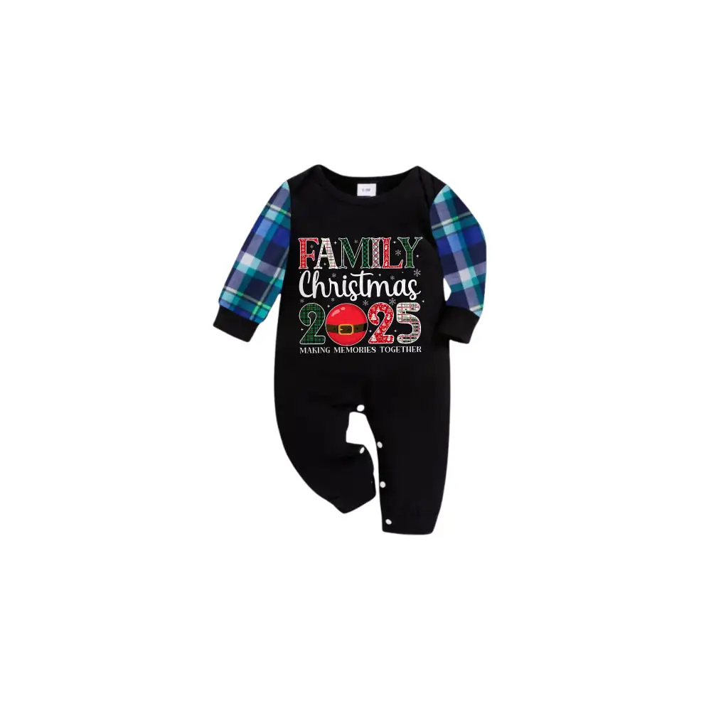 Blue and Green Plaid Christmas Pajamas Set With "FAMILY Christmas 2025" Colorful Text Print