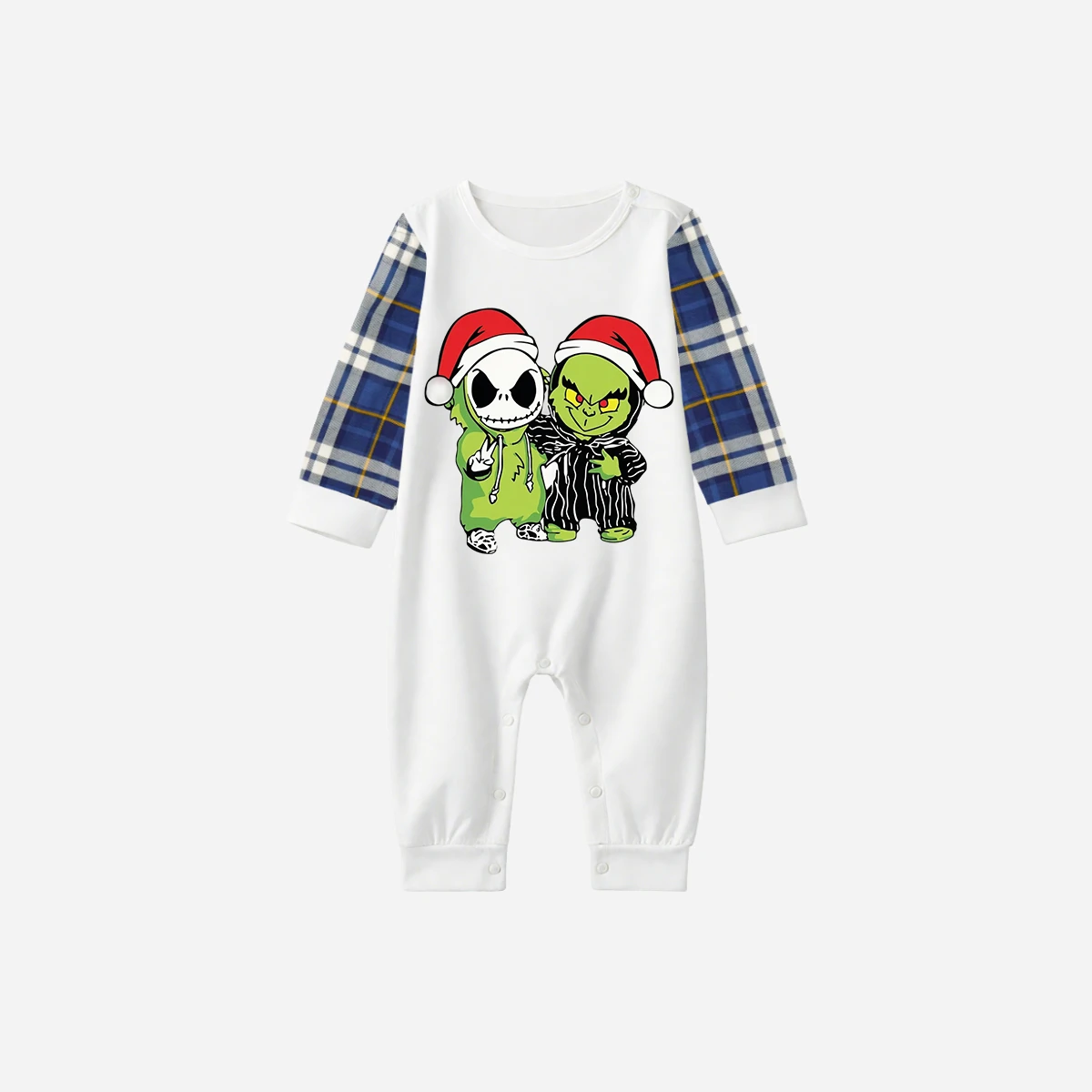 Blue Raglan Top Blue Plaid Christmas Pajamas Set With Grinch and Cartoon Pattern Print
