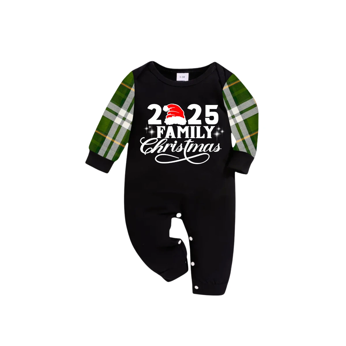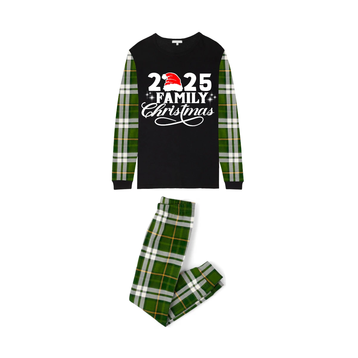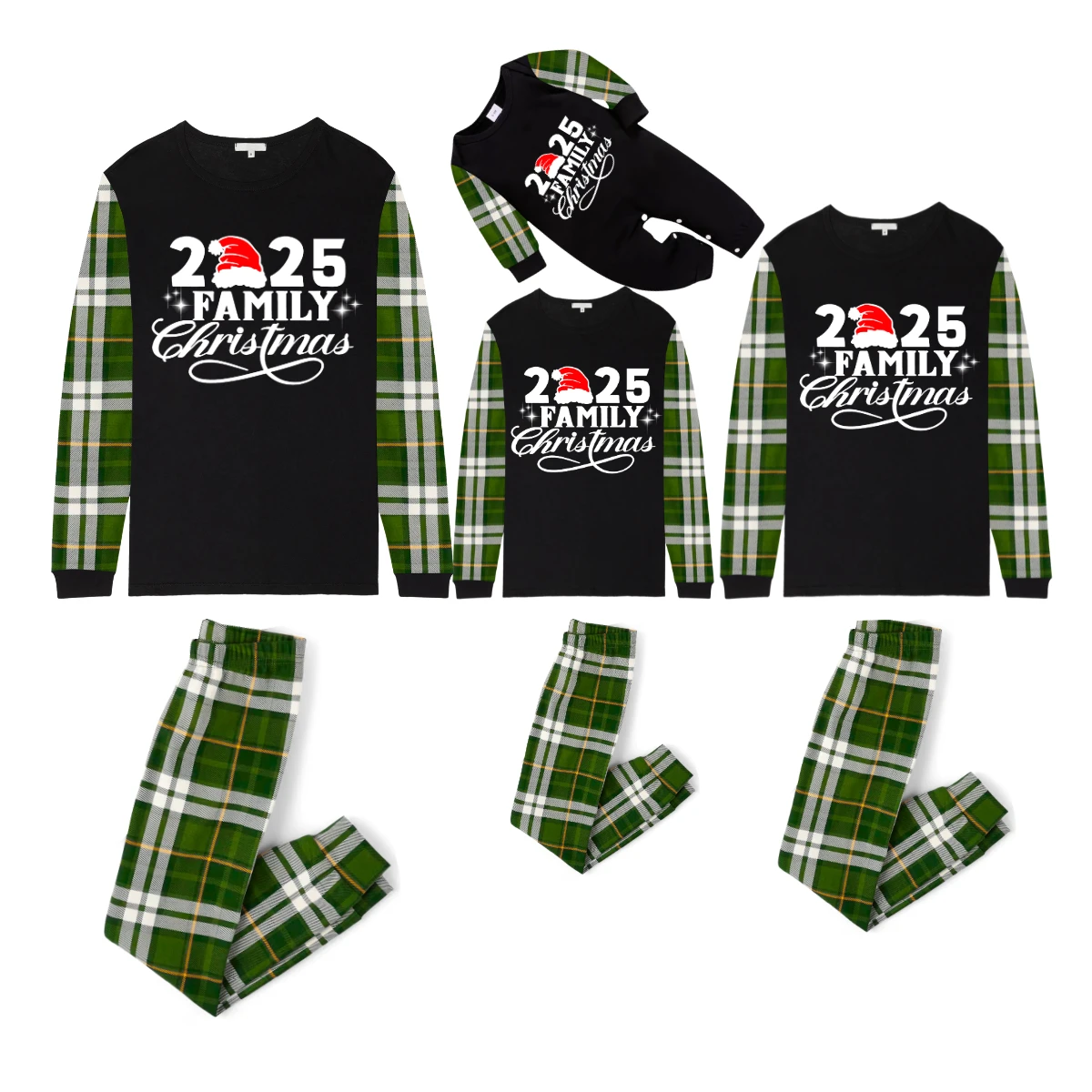 Christmas 2025 Family Matching Family Pajamas Set - Black Top, Green Pants, Plaid Pattern