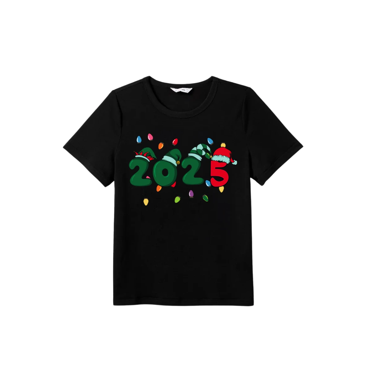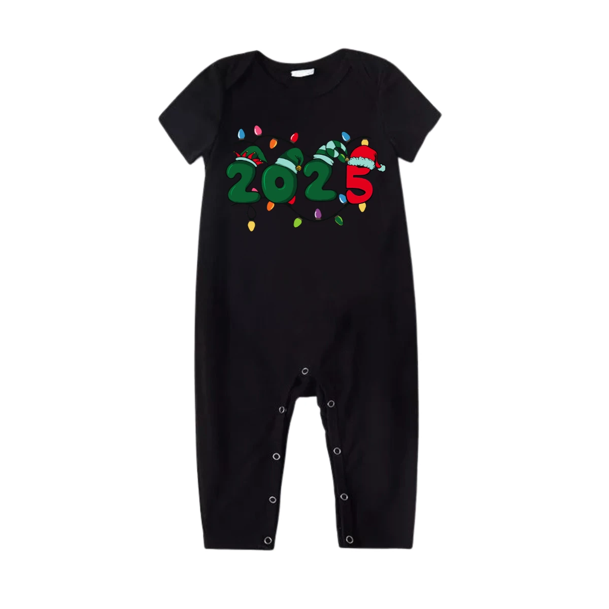 Christmas "2025" Letter Print Black Short Sleeve with Red & Black Plaid Pant Family Matching Pajamas