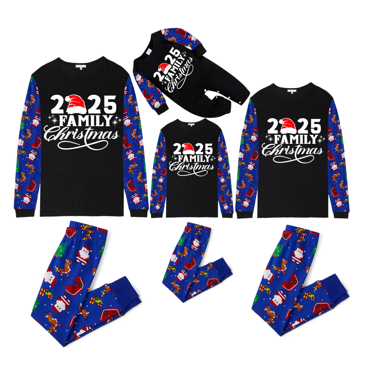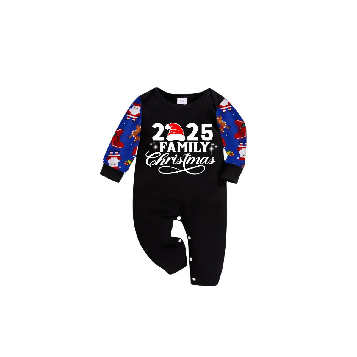 Christmas 2025 Santa Family Matching Family Pajamas Set - Black Top, Blue Pants, Santa Print Pattern
