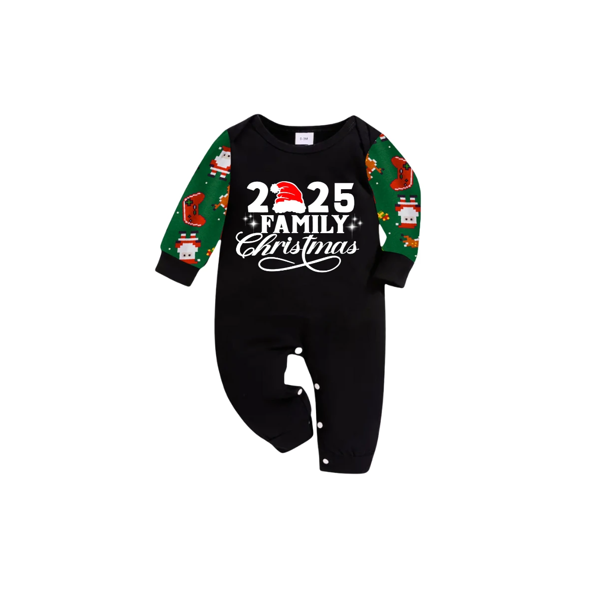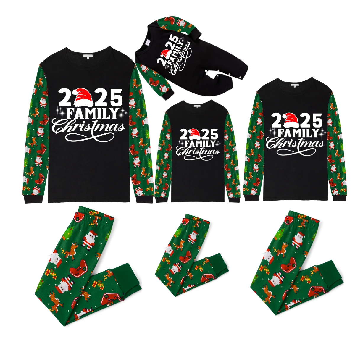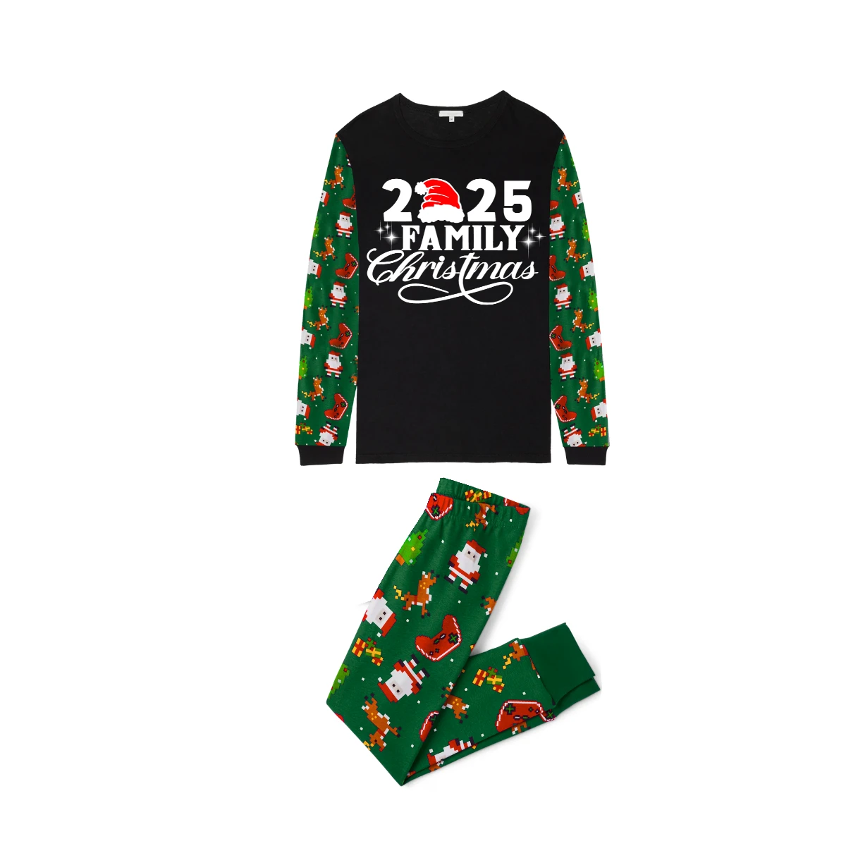 Christmas 2025 Santa Family Matching Family Pajamas Set - Black Top, Green Pants, Santa Print Pattern