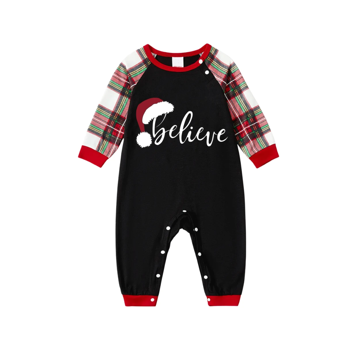 Get ready to cozy up in style with our "Christmas "Believe" Text Print Black Long Sleeve Top with Red & White & Green Plaid Family Matching Pajamas". perfect for the festive season. This adorable ensemble is designed for the whole family. including your beloved furry friend.