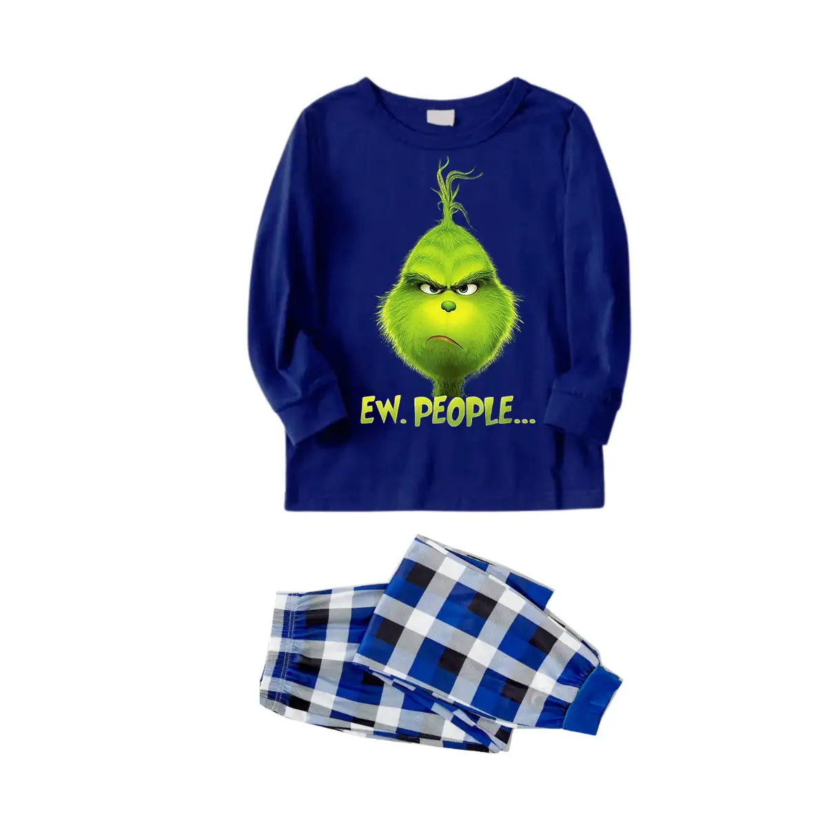 Get ready to cozy up in style with our 'Christmas Cartoon Pattern and EW People Print Blue Long Sleeves with Blue&White&Black Plaid Pants Family Matching Pajamas'. perfect for the festive season. This adorable ensemble is designed for the whole family. including your beloved furry friend.