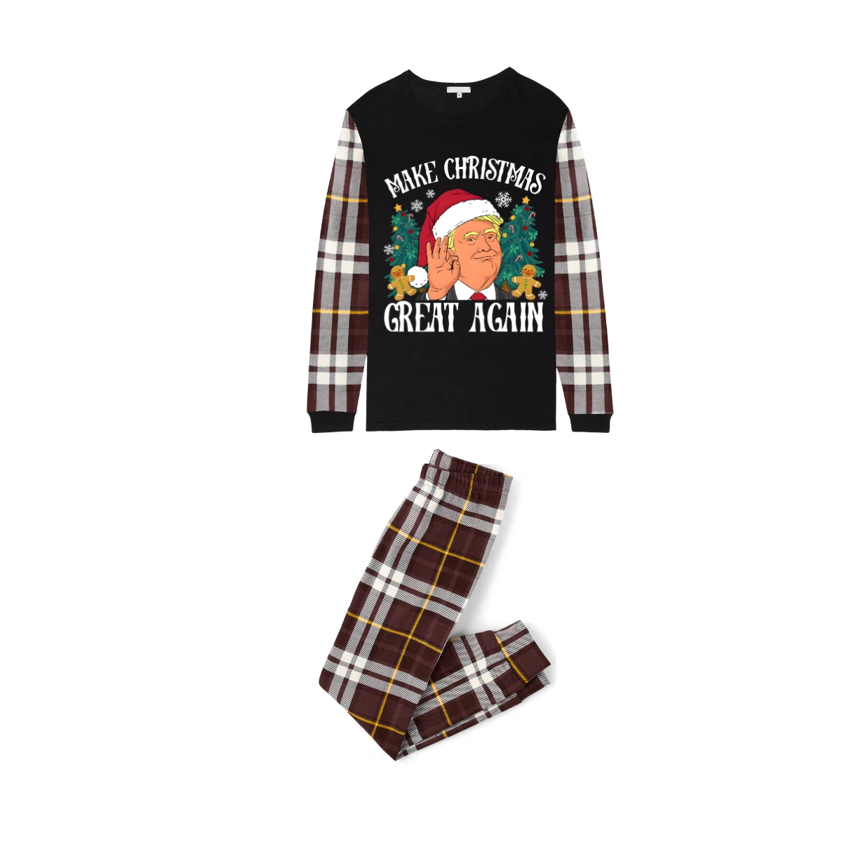 Christmas Cartoon Trump Make Christmas Great Again Family Pajamas Set - Black Top, Brown Pants, Plaid