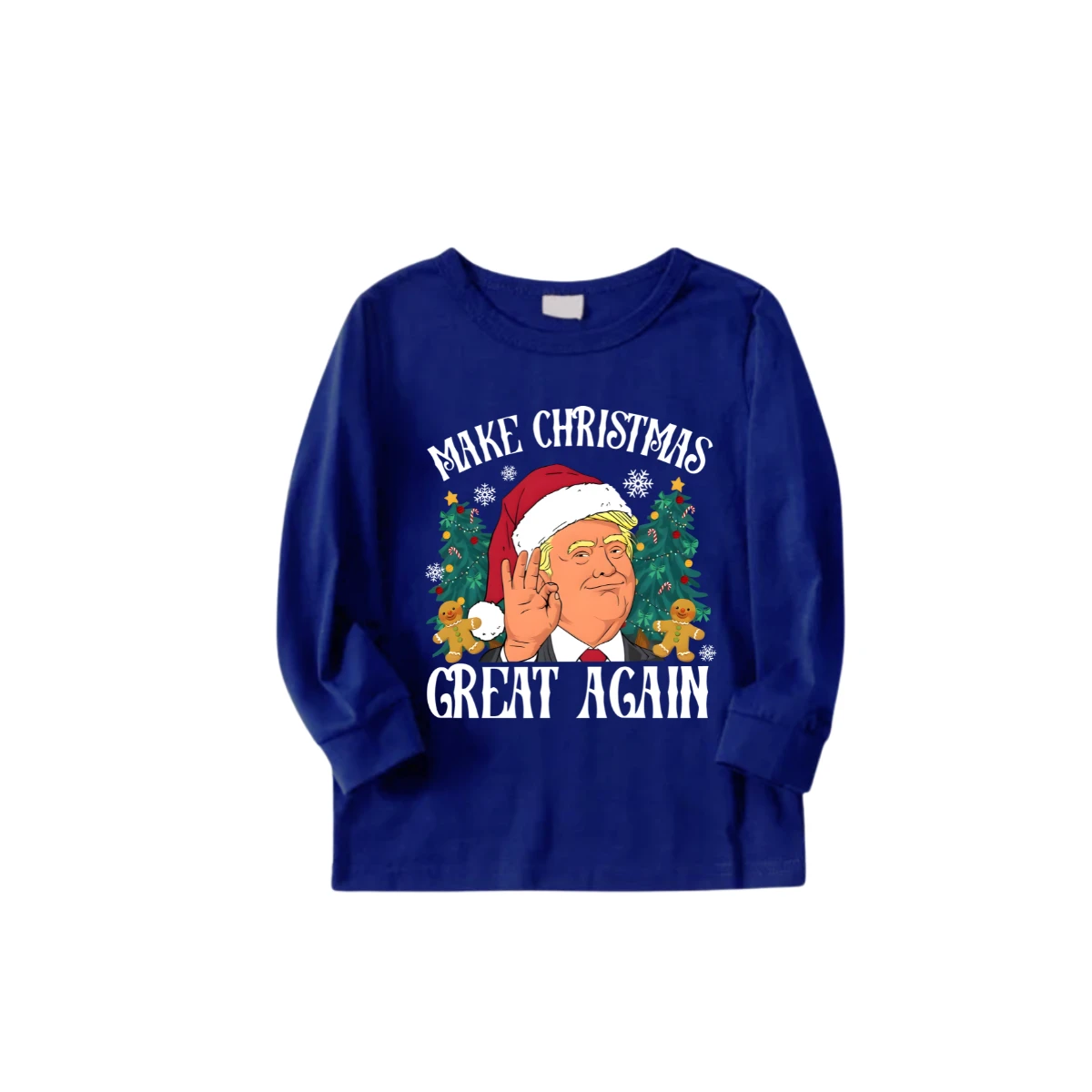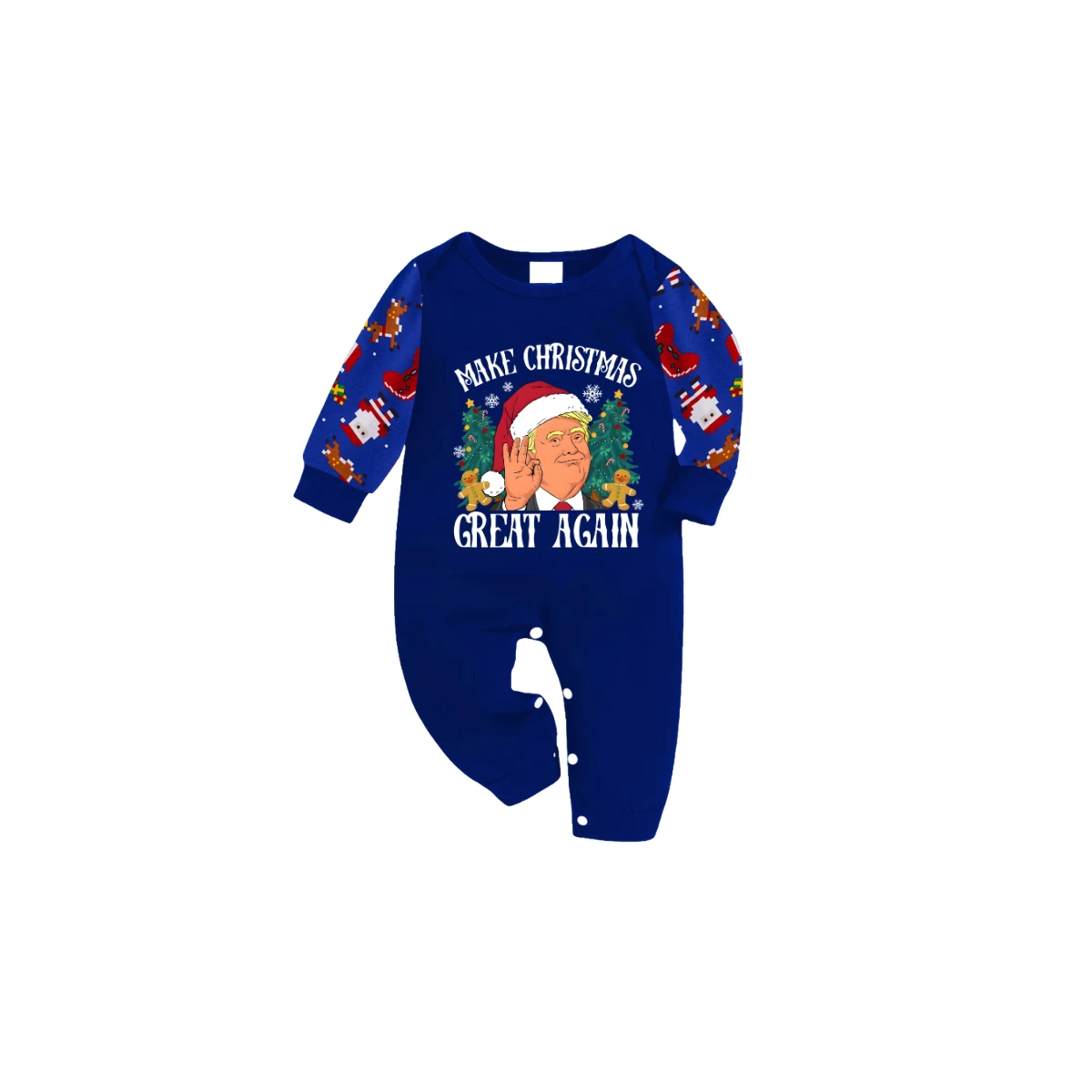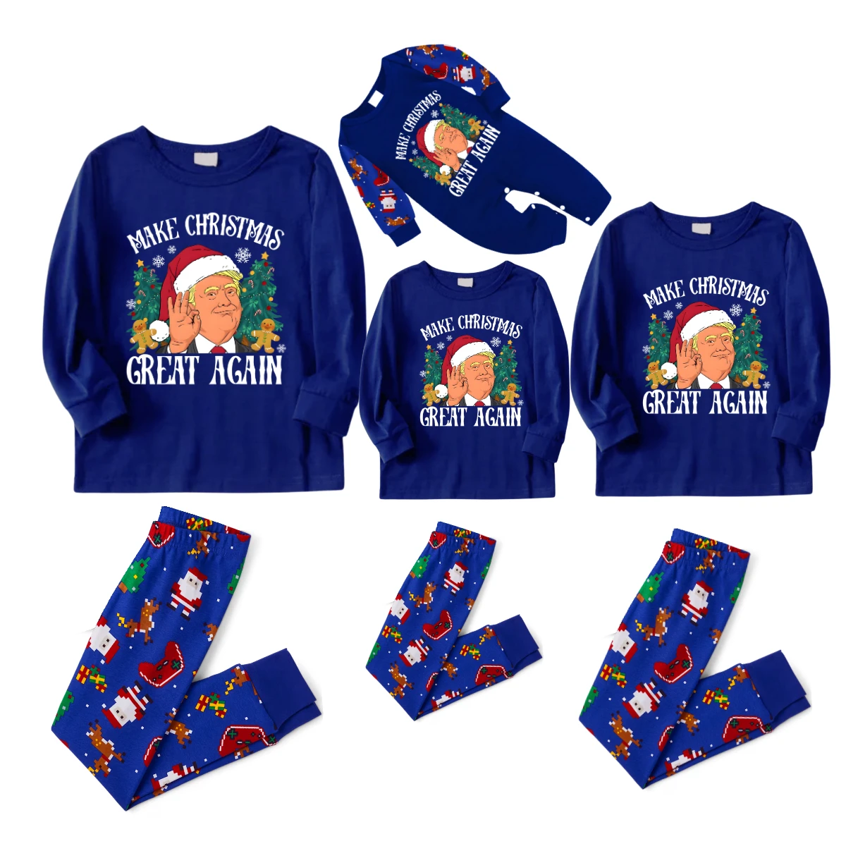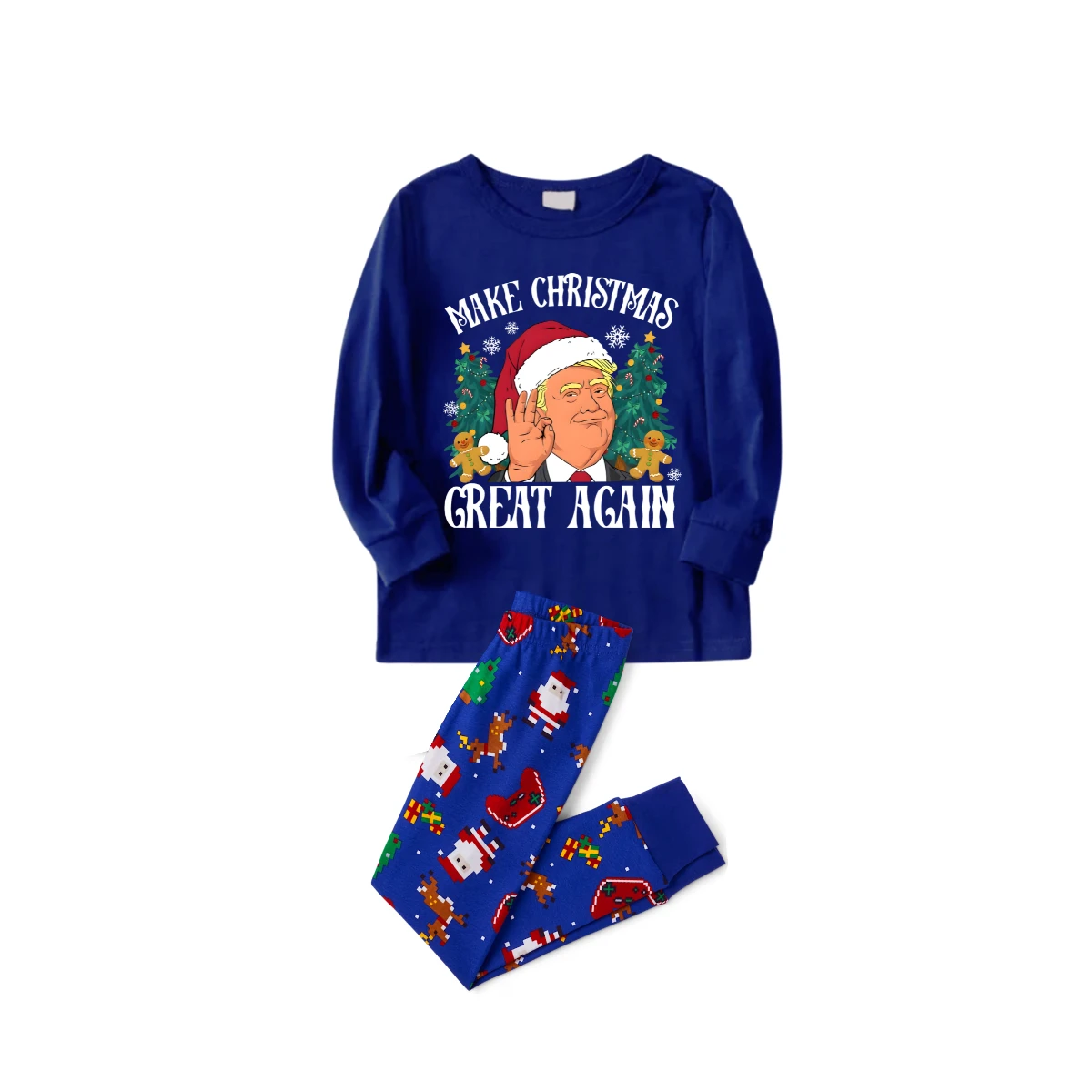 Christmas Cartoon Trump Make Christmas Great Again Family Pajamas Set - Blue Top, Blue Pants, Santa Pattern