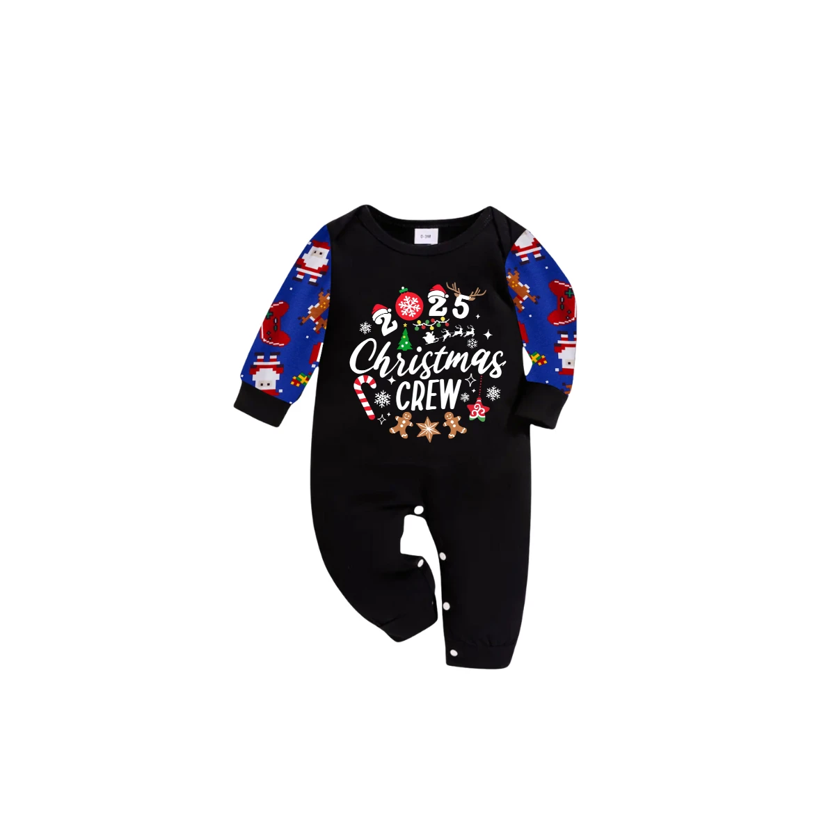 Christmas Crew 2025 Family Pajamas Set - Black Top, Blue Pants, Blue Christmas Cartoon Sleeves, Gingerbread Candy Print