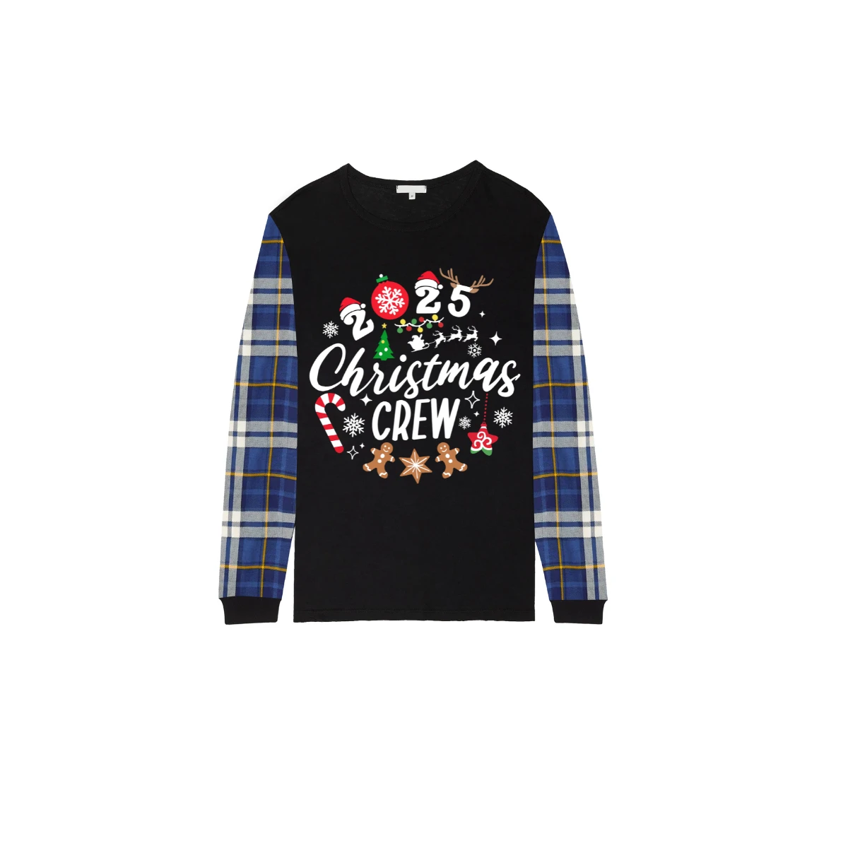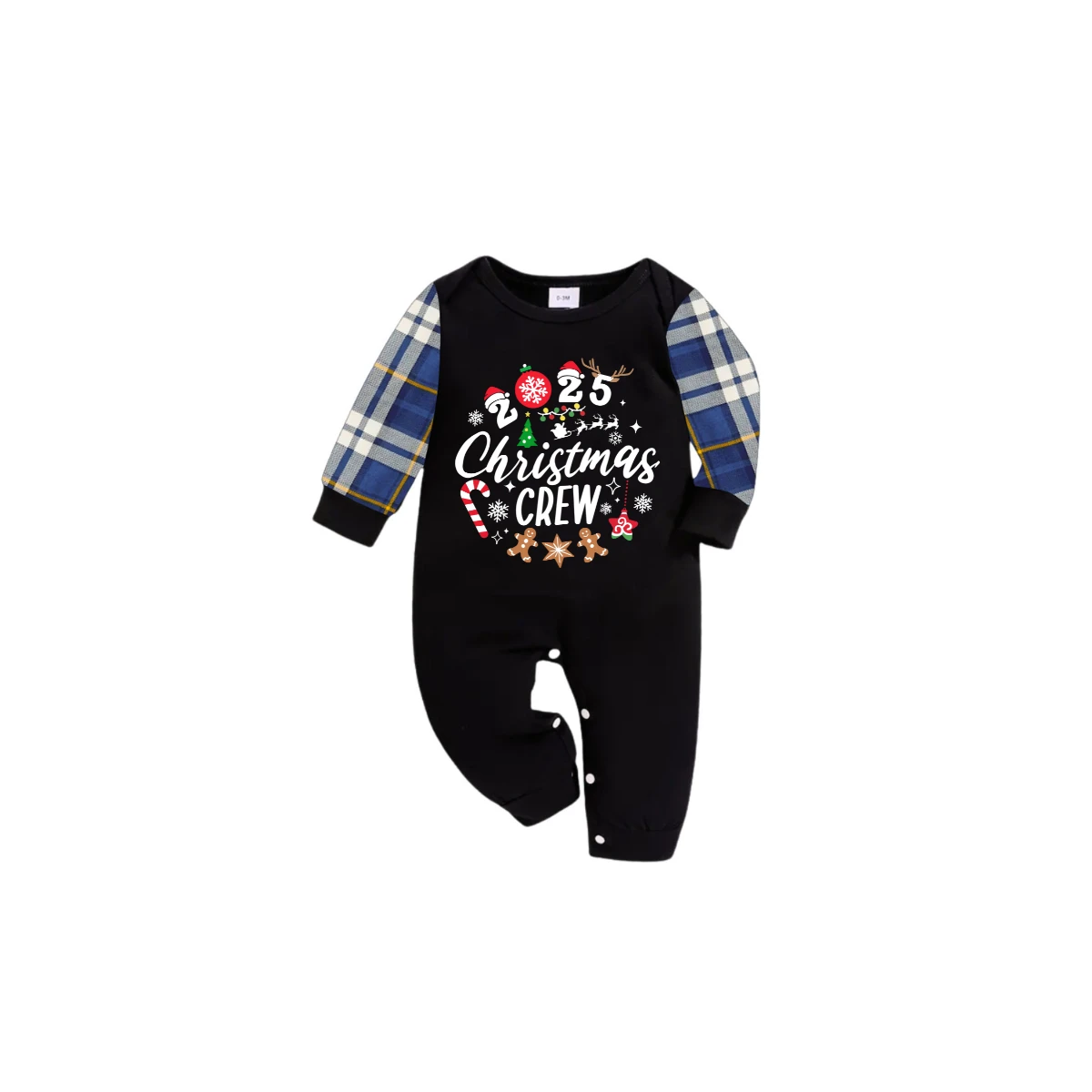 Christmas Crew 2025 Family Pajamas Set - Black Top, Blue Pants, Blue Plaid Sleeves, Gingerbread Candy Print