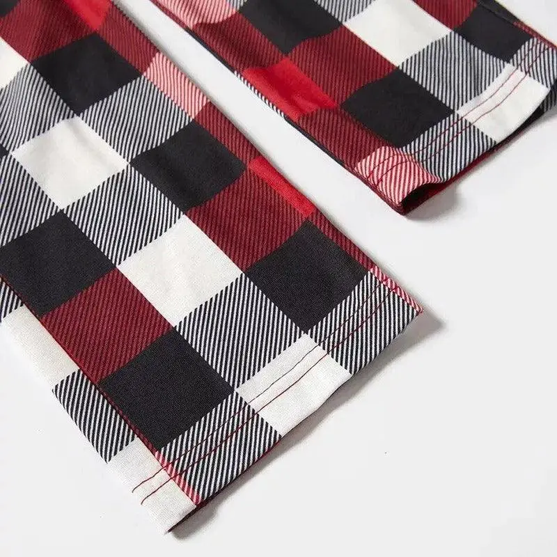 Christmas Hat and 'Believe“ Letter Print Patterned Plaid Sleeve Contrast Tops and Red & Black & White Plaid Pants Family Matching Pajamas Set With Dog Bandana