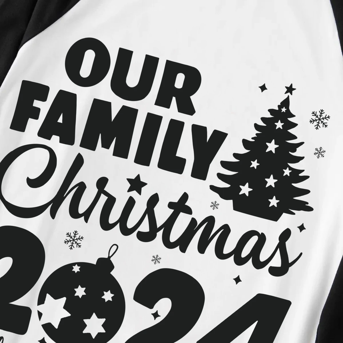 Christmas Tree & "2024 Making Memories Together" Patterned Black Sleeve Contrast Tops and and Black and Green Plaid Pants Family Matching Pajamas Sets With Dog Bandana