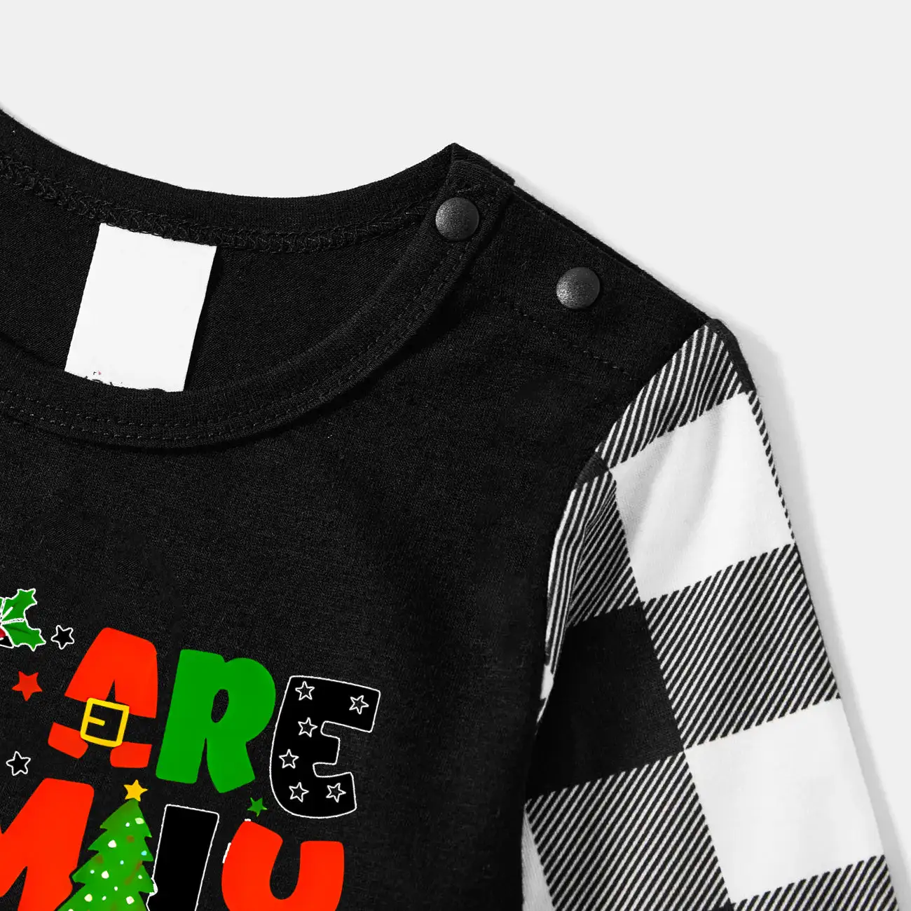Get ready to cozy up in style with our "Christmas "We are Family" Colorful Multi-Element Letter Black Long Sleeve Top with Black And White Plaid Pants Family Matching Pajamas". perfect for the festive season. This adorable ensemble is designed for the whole family. including your beloved furry friend.