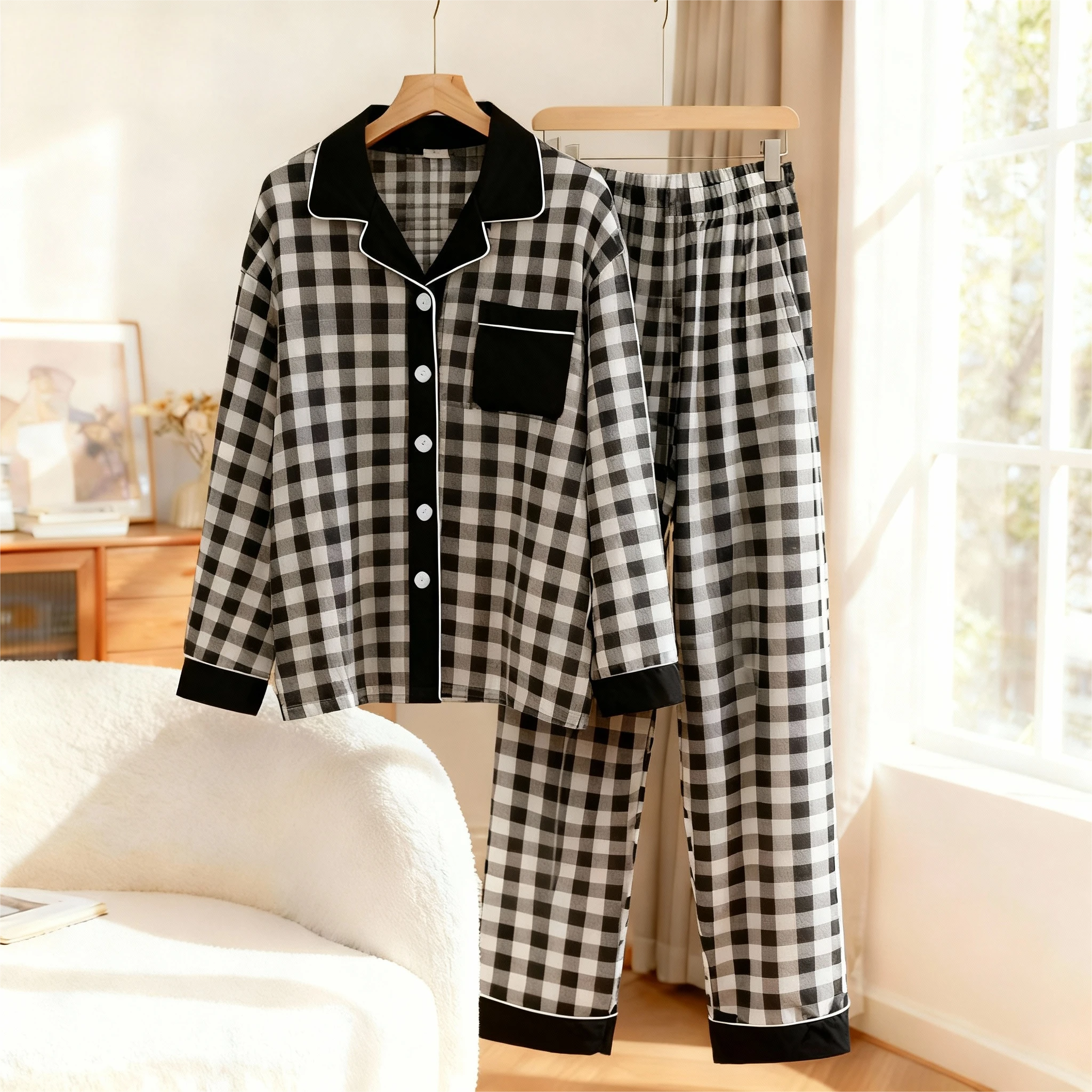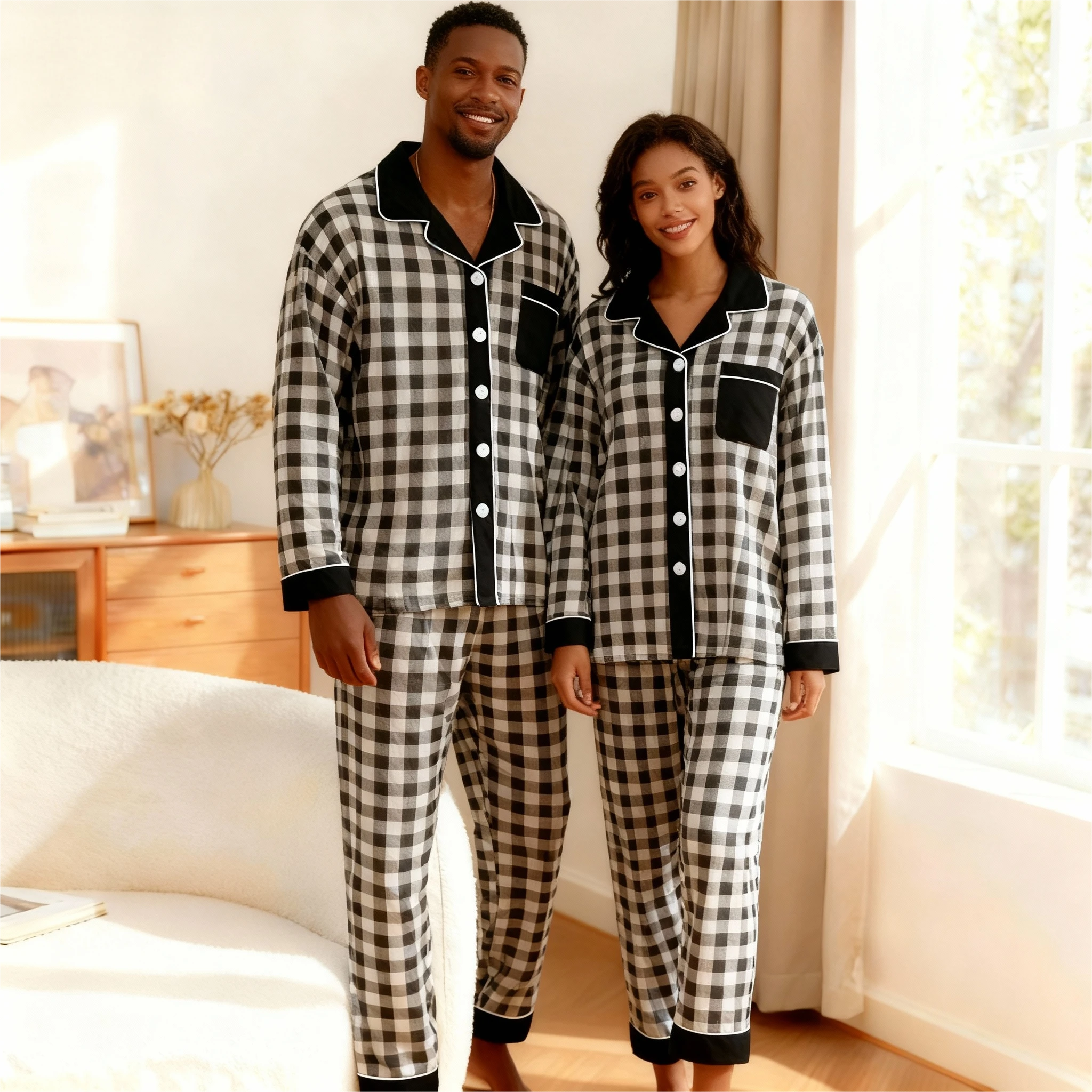 Matching festive sleepwear for couples! Enjoy classic comfort with a button-up top and relaxed ankle-length pants. The loose fit is perfect for lounging. Pants have handy side pockets (top has no chest pocket). Easy care: machine washable and colorfast. Enjoy the holidays together in cozy style!