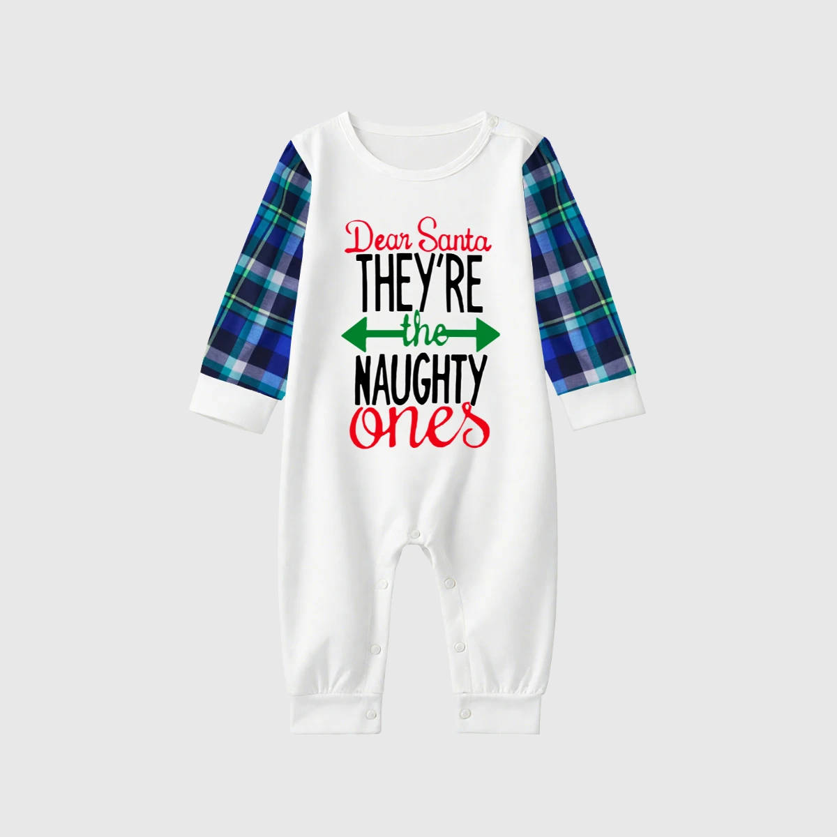 Dear Santa Naughty Ones Family Pajamas Set - White Top, Blue Plaid Pants, Plaid Sleeves