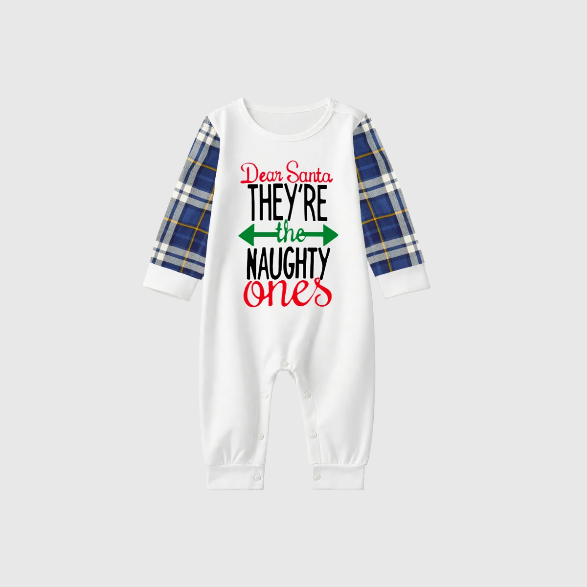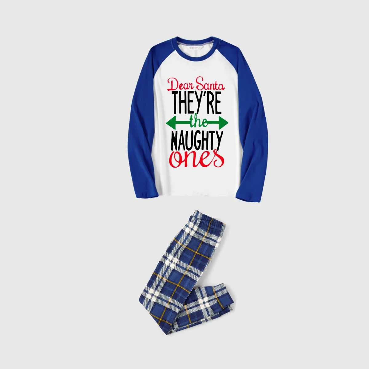 Dear Santa Naughty Ones Family Pajamas Set - White Top, Blue Plaid Pants, Raglan Sleeves