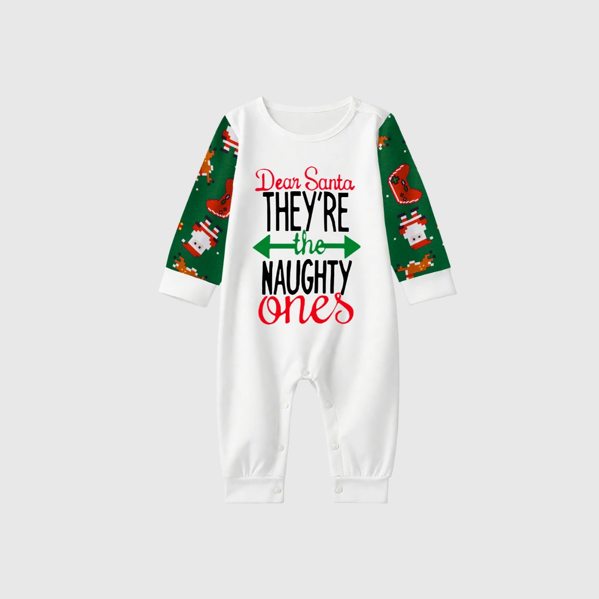 Dear Santa Naughty Ones Family Pajamas Set - White Top, Green Christmas Pattern Pants, Green Sleeves