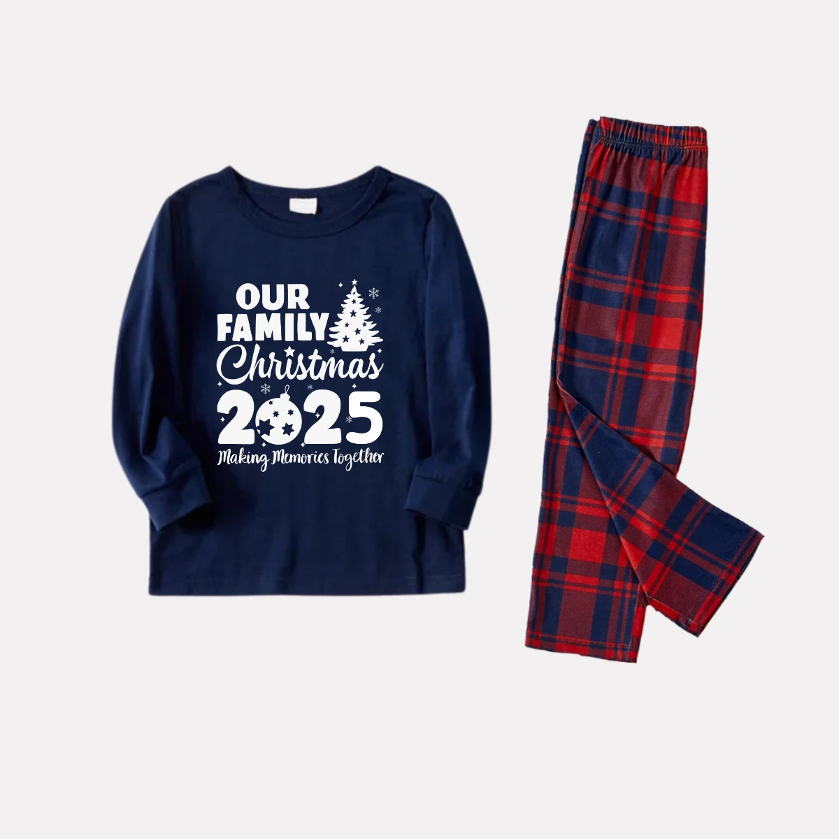 'Our Family Chirstmas 2025 Making Memories Together' Letter Print Blue Long Sleeves Top with Red and Blue Plaid Pants Christmas Matching Pajamas