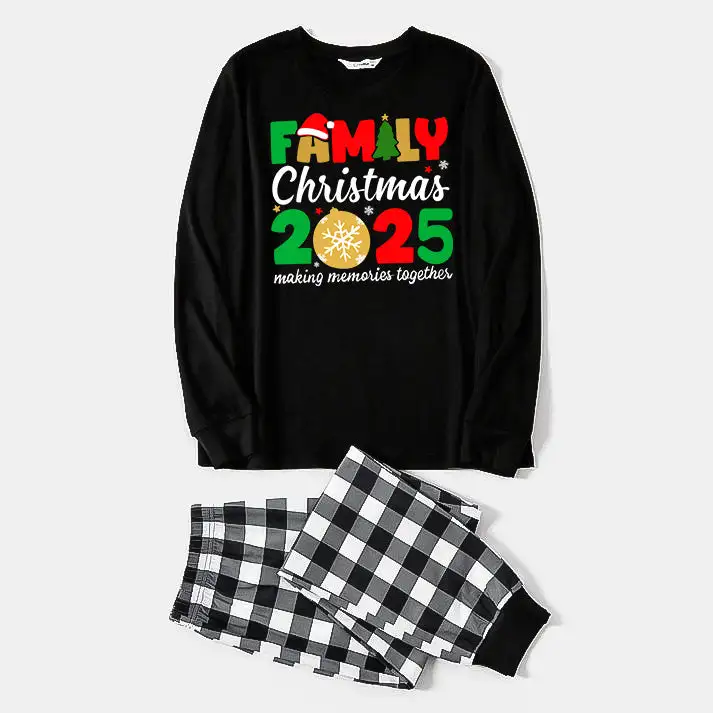 "Family Christmas 2025" Cute Text and Santa Hat Prints Black Long Sleeve Top with Black And White Plaid Pants Family Matching Pajamas