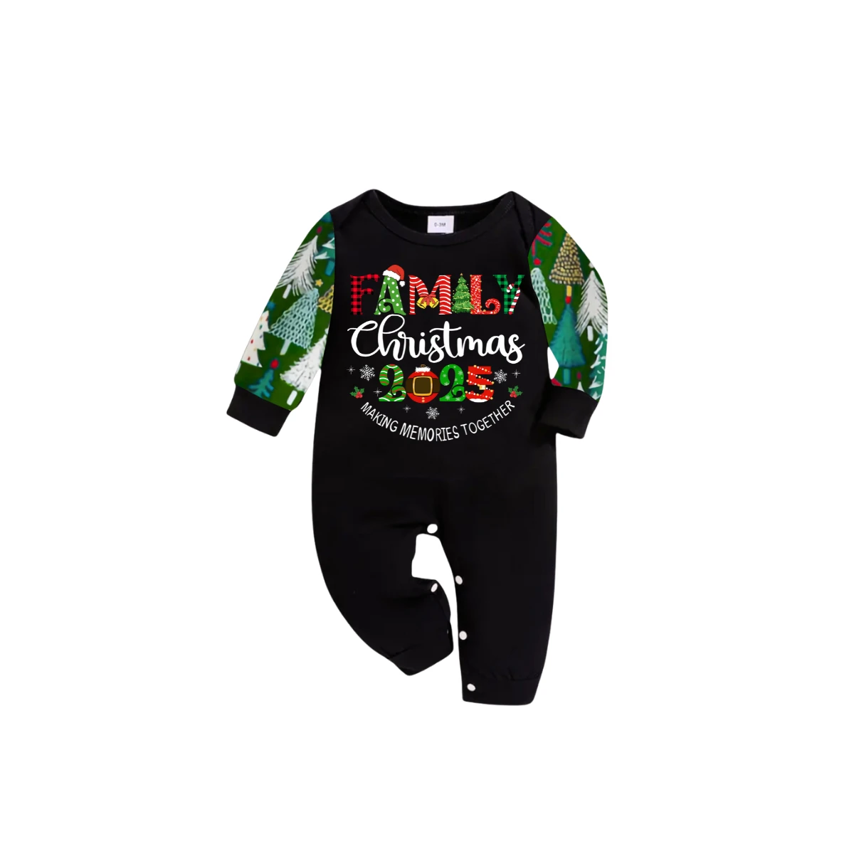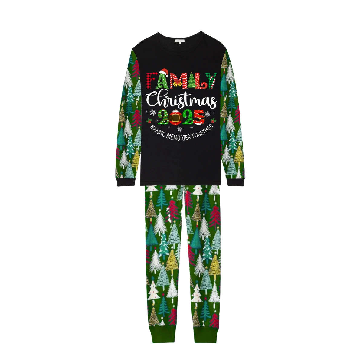 Family Christmas 2025 Making Memories Family Pajamas Set - Black Top, Green Pants, Christmas Tree Print Sleeves