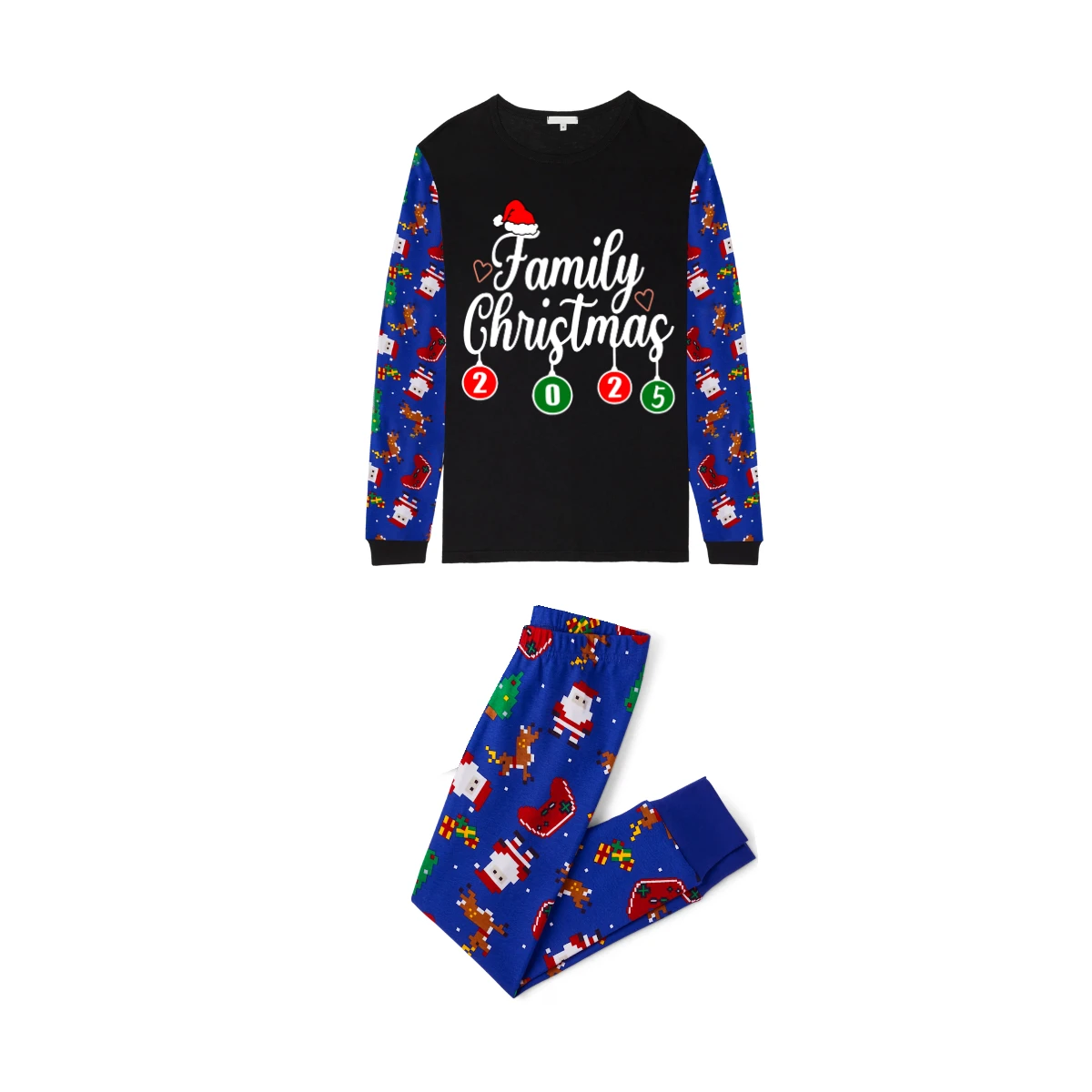 Family Christmas 2025 Pajamas Set - Black Top / Blue Santa & Reindeer Print Sleeves & Pants