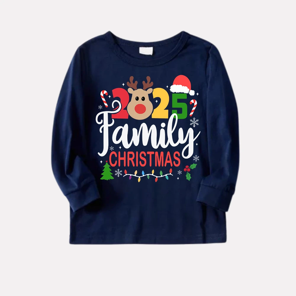 "Family Christmas 2025" Text and Deer Prints Blue Long Sleeves Top with Red and Blue Plaid Pants Christmas Matching Pajamas