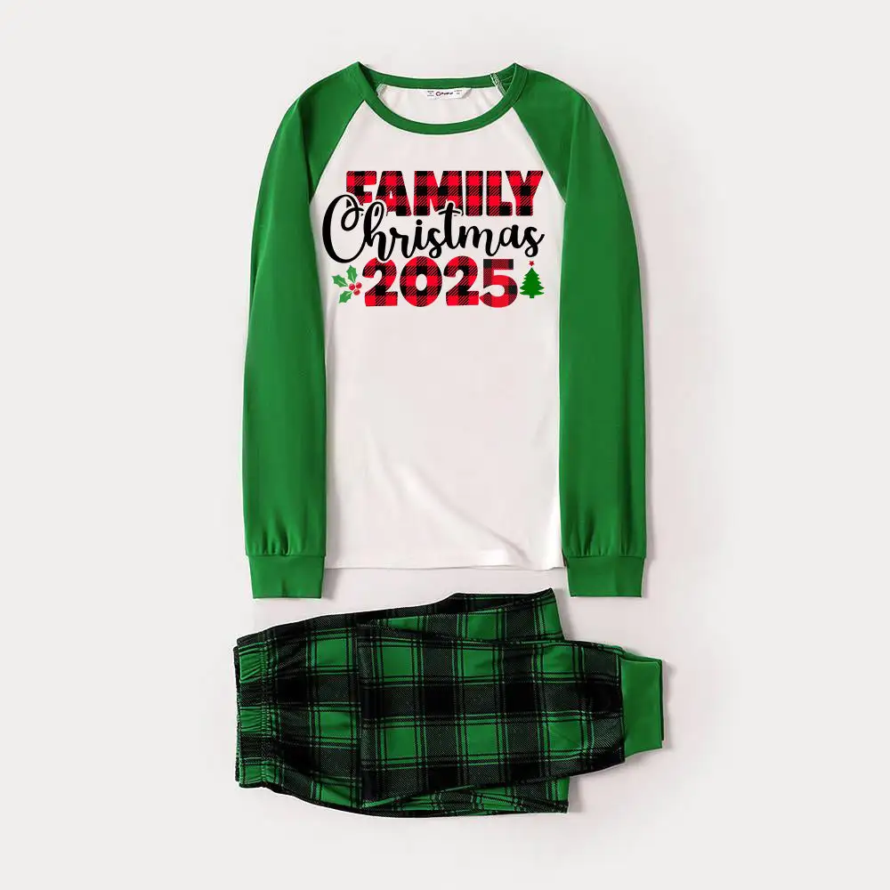 Family Christmas 2025 Text Print Long Sleeve Top With Green & Black Plaid Christmas Matching Pajamas