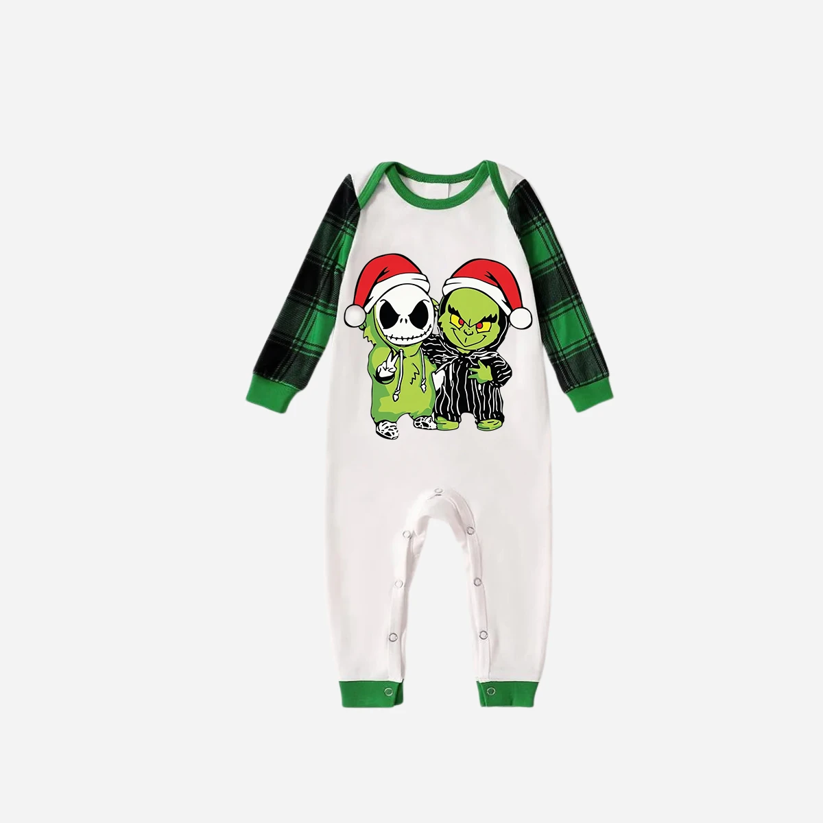 Green Raglan Top Green Plaid Christmas Pajamas Set With Grinch and Cartoon Pattern Print