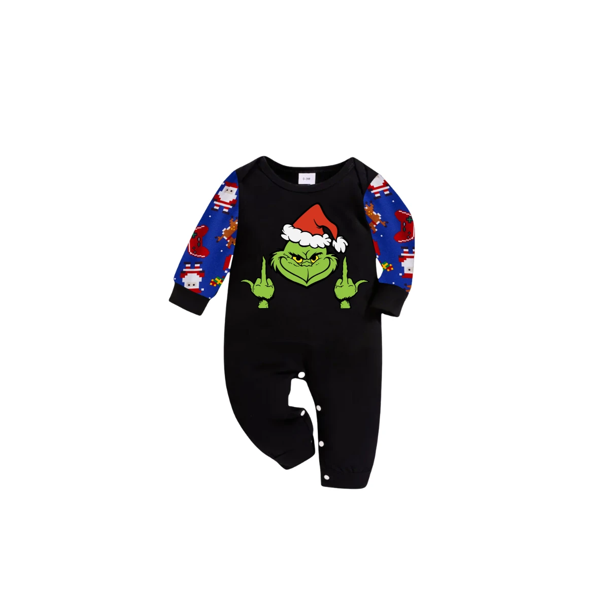 Grinch Santa Family Christmas Pajamas Black Top with Blue Santa Print Pants